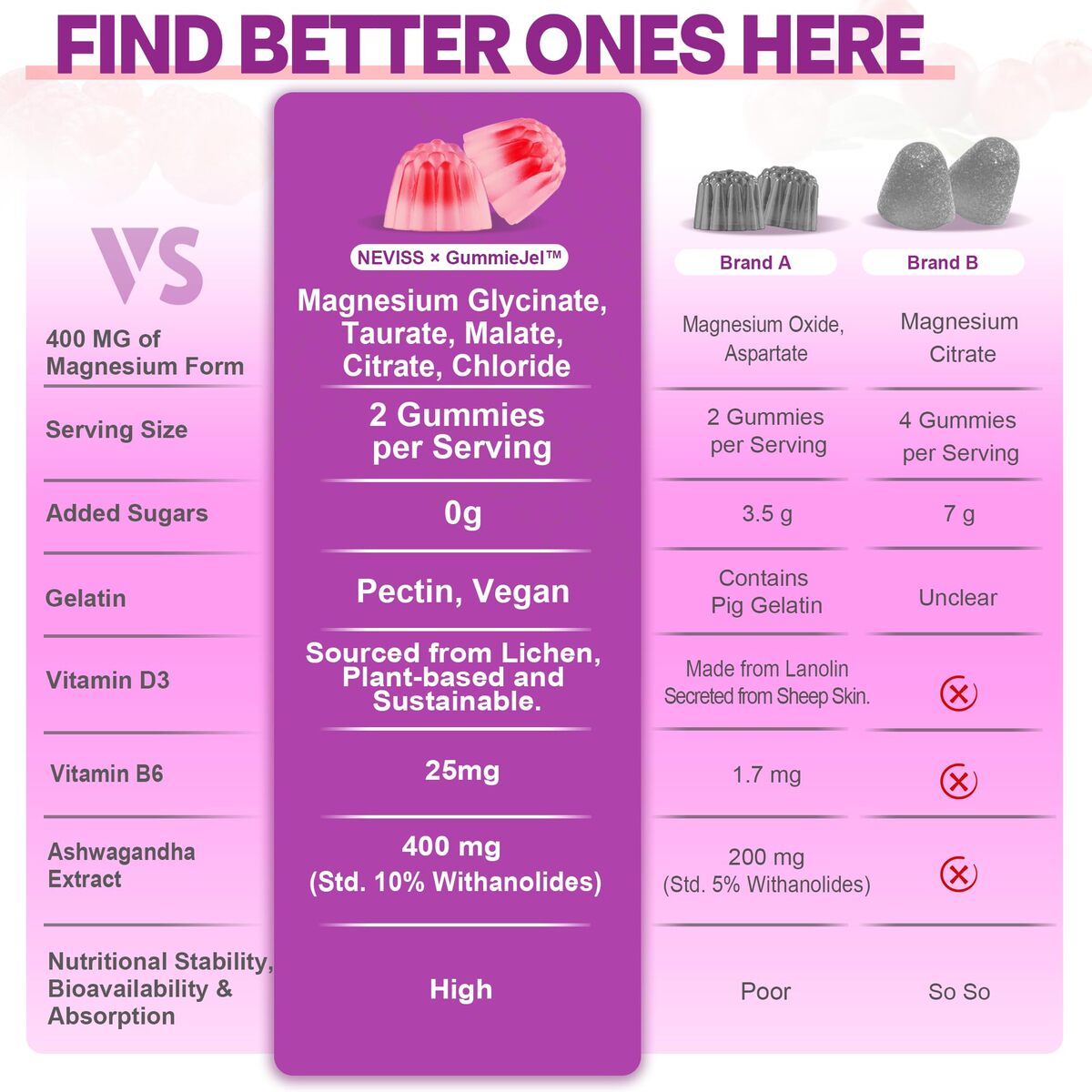 ? 5-IN-1 FULL-SPECTRUM MAGNESIUM COMPLEX - NEVISS magnesium complex gummies feature 5 highly absorbable forms of Mag?Glycinate, Malate, Citrate, Taurate, and Chloride?plus black pepper extract. This multiple-form approach ensures better overall absorption and avoids over-reliance on one pathway, powerfully supporting muscles, bones, nerves, and calmness without digestive upset often caused by magnesium oxide. Magnesium glycinate is prized for its ability to promote relaxation and restful rest.,?ENERGY, RELAXATION BALANCE - Experience steady energy and calm focus with our chewable magnesium complex for women and men, combining magnesium glycinate, malate, and citrate to fuel cellular energy and nourish the brain. Infused with 400 mg of 10:1 concentrated Ashwagandha extract, this adaptogen + mineral combo helps you build resilience in the face of stressors and stay focused, ensuring a balanced, relaxed feeling throughout the day. Just 2 gummies daily to get the benefits.,? MAGNESIUM MALATE COMPLEX WITH D3 - Magnesium malate helps support endurance and vitality. Fortified with vegan Vitamin D3 (1600 IU), Vitamin B6 (25 mg), Zinc, and Potassium, these essential nutrients work together to maintain electrolyte balance, steady energy, and m??d ease. Whether you?re unwinding after a long day or recharging post-exercise, these magnesium complex gummies help your body regain its natural rhythm and flexibility, promoting smooth recovery and vitality.,? MAGNESIUM LIQUID-FILLED GUMMIES - Unlike standard magnesium supplements, our 5-in-1 magnesium gummies use innovative GummieJel liquid-filled technology for faster and steadier nutrient release. Each nutrient?Vitamin D3, Magnesium, and trace minerals?locks in a protective liquid matrix from oxidation and pH changes, while the tasty mixed berry flavor pectin shell protects key nutrients for optimal stability and superior potency.,? PURE, TASTY TRUSTED QUALITY - Made for modern wellness seekers, these all-in-one magnesium gummies for women men are sugar-free, gluten-free, and gelatin-free. Crafted under the highest standards and 3rd-party tested for purity and potency, each bottle delivers clean, reliable nutrition. Free from GMOs, soy, and preservatives, NEVISS ensures that every bite of your magnesium glycinate gummies supports a healthier, calmer, and more balanced you.