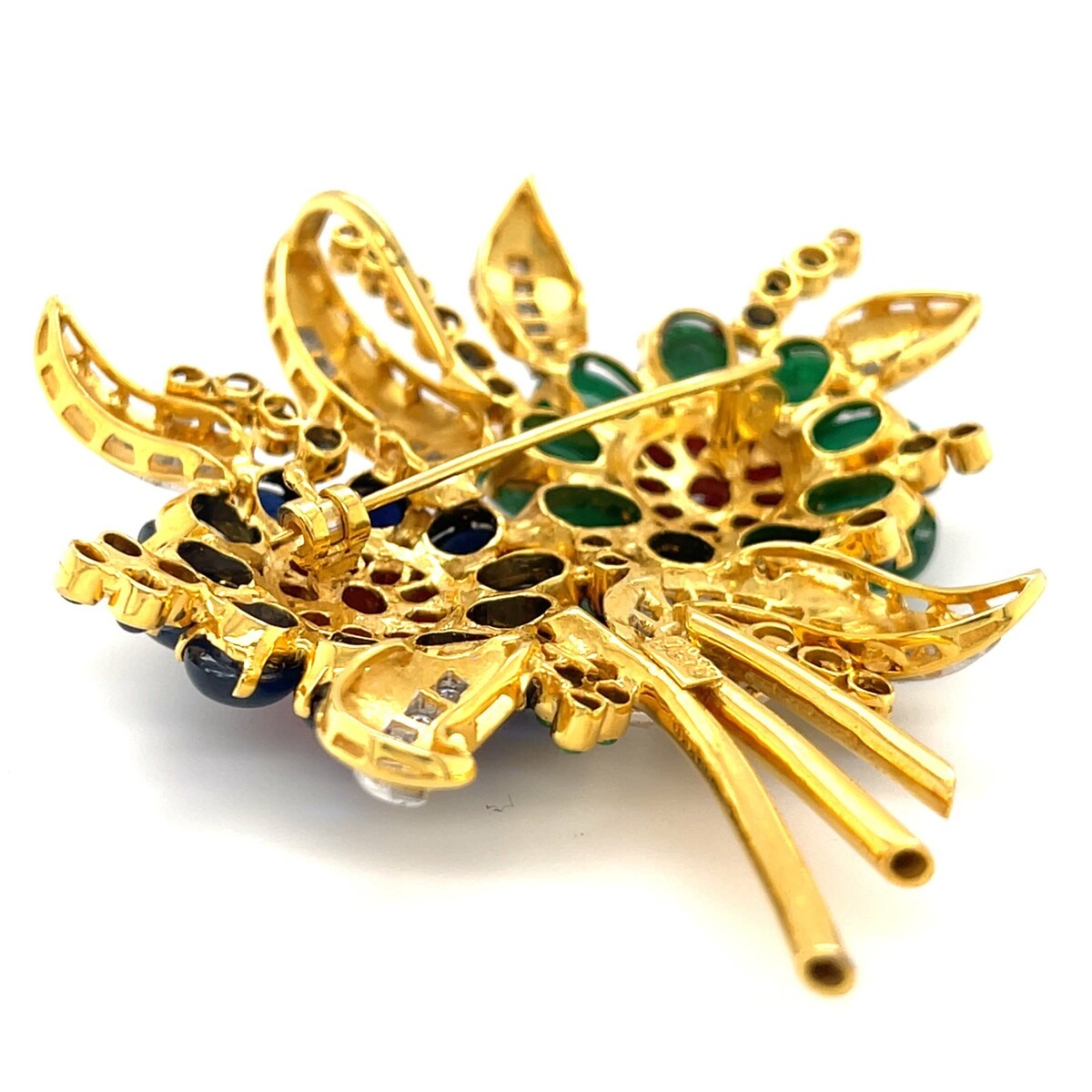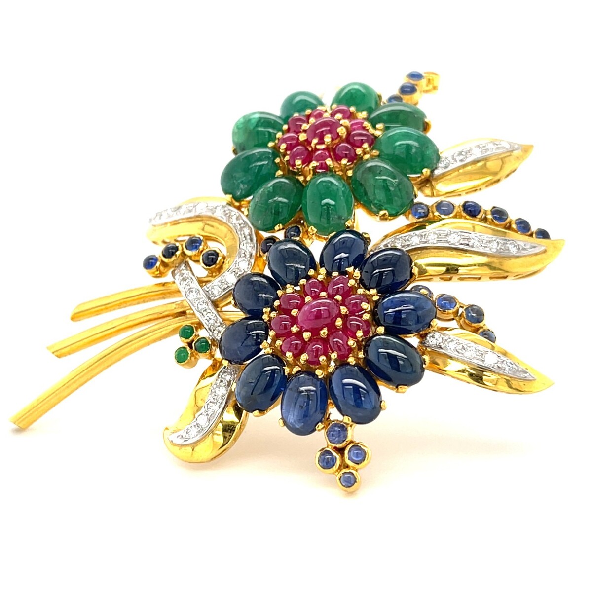 18k Gold Emerald, Sapphire, Ruby and Diamond Floral Brooch 2-5/8" x 2" 31.2g