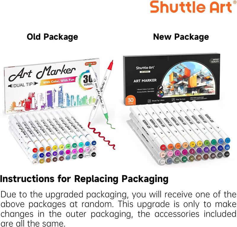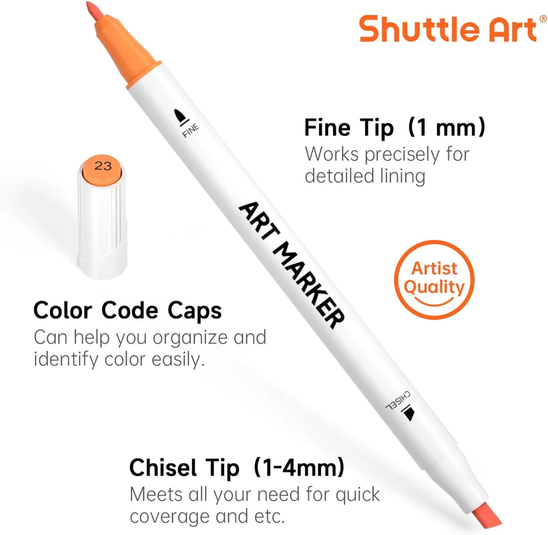 Shuttle Art 30 colors Art Markers set provides 30 unique eye-catching and vibrant colors including all the primary colors you might need for your art creation, and it can be blended nicely for added dimension to your artwork. Our markers feature a 4mm broad chisel tip for quick coverage and a 1mm fine bullet tip for detailed lines highlight. It's ideal for coloring, drawing, sketching, illustrating, shading, designing, rendering, comics, adult coloring books and more. Each Marker Cap is marked with color code at both ends makes it easier to choose right color. Small Round barrel design makes it comfortable to hold. And there also have ridges on the cap to prevent the markers from rolling off on smooth surfaces. Our Art Markers are long-lasting,quick-drying,waterproof, smear proof and fading resistant.