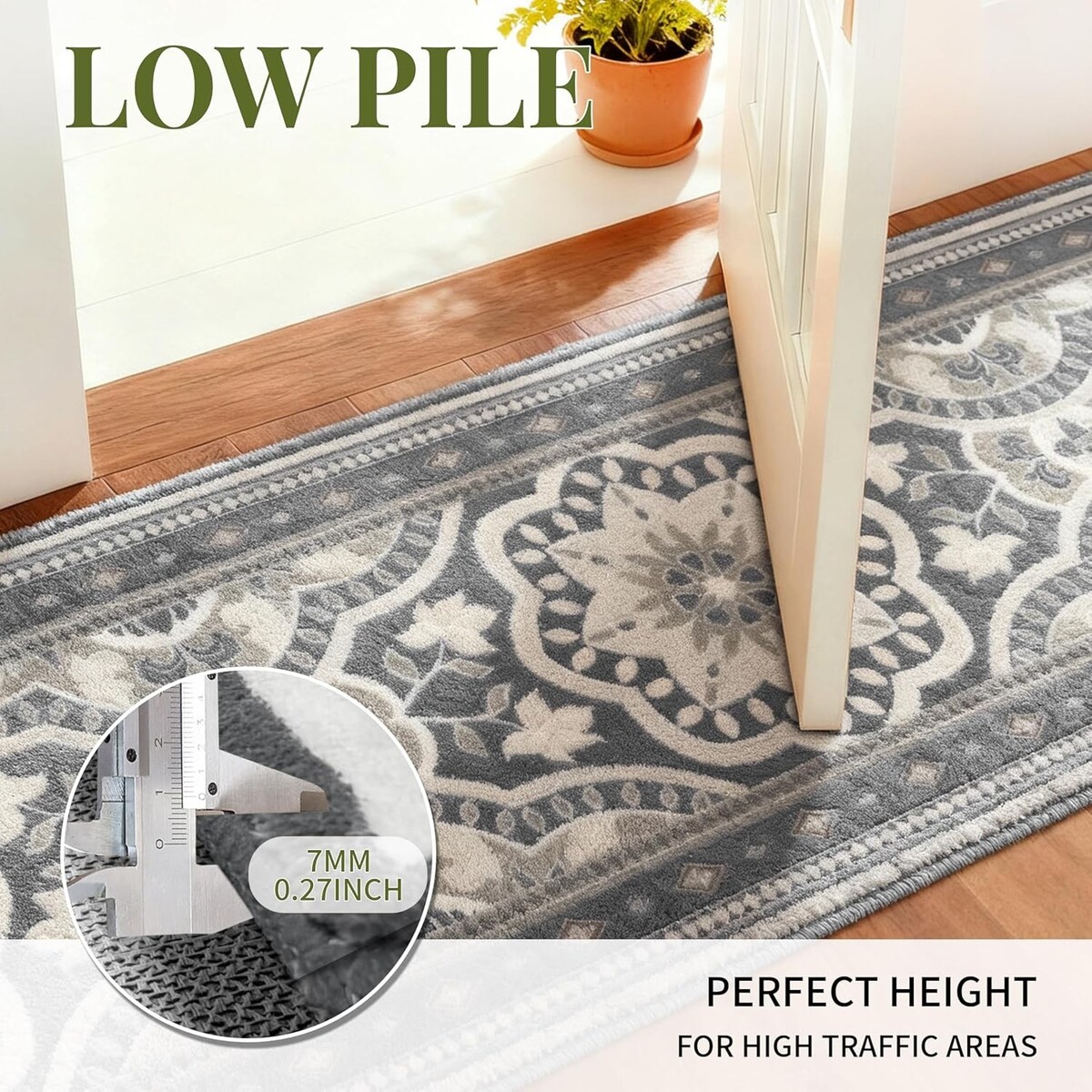 Low-pile construction (7mm/0.27 inch) suitable for easy door movement.
