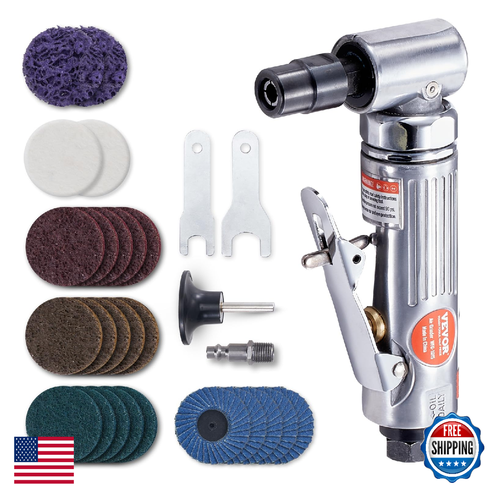 Powerful plus Robust: VEVOR's air die grinder has a ball-bearing construction, provides a robust 20,000 RPM operation at 90 PSI and 3.5 CFM air consumption, pair it with a 1.5HP air compressor for precise, high-powered grinding tasks every time.,Versatile Ready for Anything: Whether it's automotive, metalwork, or furniture crafting, this air grinder kit has you covered. Included are 24 top-quality sanding discs ? from wool discs for polishing to nonwoven discs for surface treatments. One tool, countless applications.,Built to Last: Quality is in the details. Our air die grinder is fortified with an aluminum housing, durable ball bearing construction, and precision-machined steel gears. The 1/4" high-precision collet stands up to intense forces, ensuring long-lasting performance.,User-Friendly Lightweight Design: Weighing just 1.2 pounds and designed for a one-handed grip, our angle die grinder is a breeze to operate. Its ergonomic structure combined with a right-angle head makes even tight or angled grinding straightforward.,Safety First, Always: Our air grinder tool's safety lock ensures zero accidental startups. Plus, the rear exhaust design doesn't just keep noise levels down; it ensures exhaust won't be a bother, prioritizing your comfort and safety.