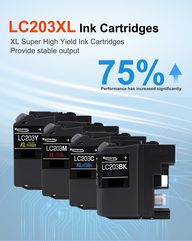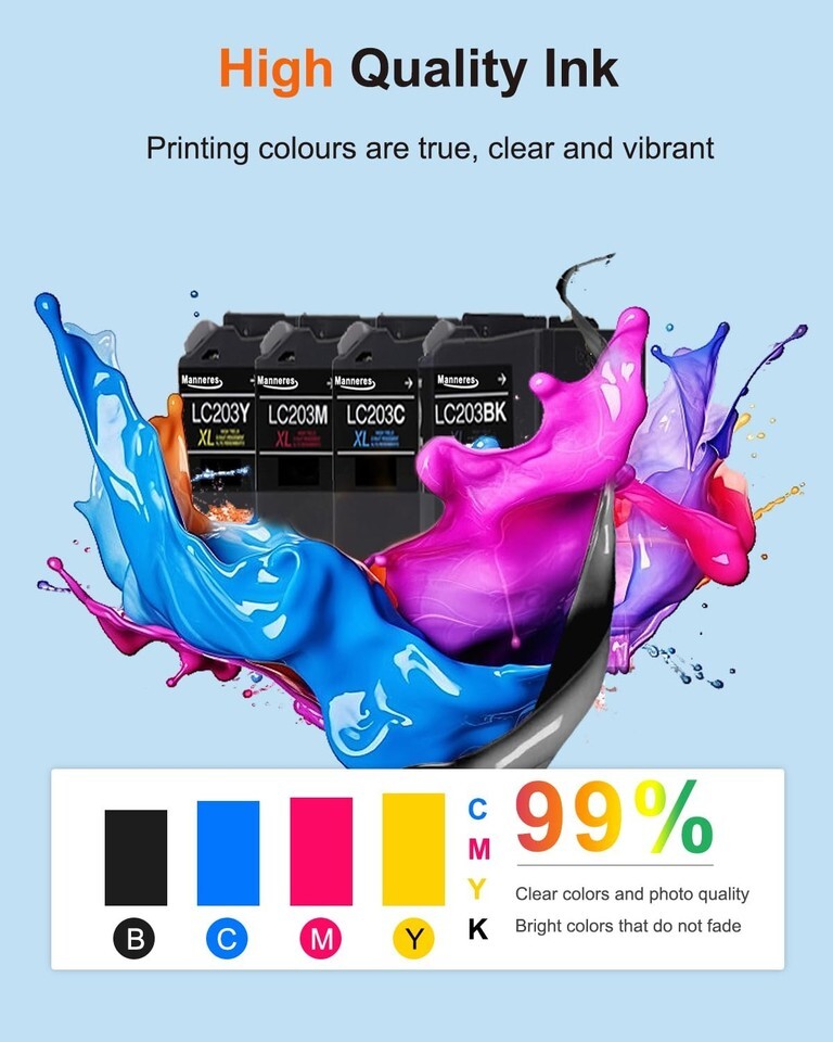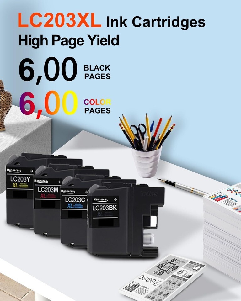 Complete 4-Pack Set - Full Color Printing: Your all-in-one solution for vibrant printing. This value pack includes: One each of High-Yield Black, Cyan, Magenta and Yellow LC203XL ink cartridges.Ensuring you're ready for any printing task,Seamless Compatibility Easy Installation: A direct replacement for Brother lc203 xl ink cartridges. Equipped with an intelligent chip, it can precisely print and detect. Working with MFC-4320DW MFC-J4420DW MFC-J4620DW MFC-J460DW MFC-J480DW MFC-J485DW MFC-J5520DW MFC-J5620DW MFC-J5720DW MFC-J680DW MFC-J880DW MFC-J885DW Printer,High Page Count - Low Cost: Each LC203XL ink cartridges can output at least 600 pages, allowing you to achieve print quality comparable to the original at a low cost. These 4 packages offer a total of 2,400 pages, making them ideal for use in homes, offices and schools. (Letter/A4, 5% coverage),Anti-Clogging Technology - Protect Your Printer: Say goodbye to clogging print heads! Our advanced ink formula can prevent drying out and corrosion, ensuring stable performance even when not in use for a long time. Reduce your troubles, avoid waste and save on expensive printer maintenance costs,Vivid Photos Clear Text: Our ink is meticulously designed with rich and realistic color effects and clear professional-level high quality text. You can enjoy professional-level printing at home. Low cost and high quality, allowing you to print the photo documents you want without any worries