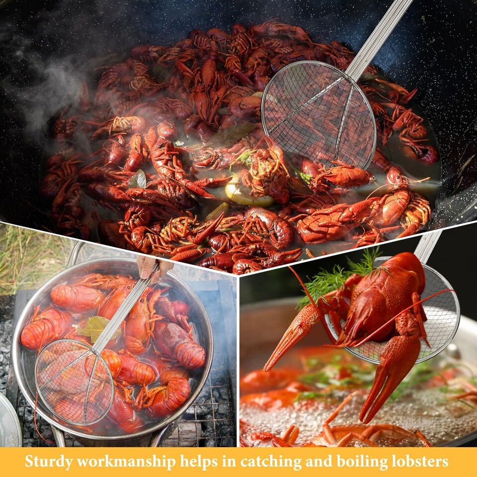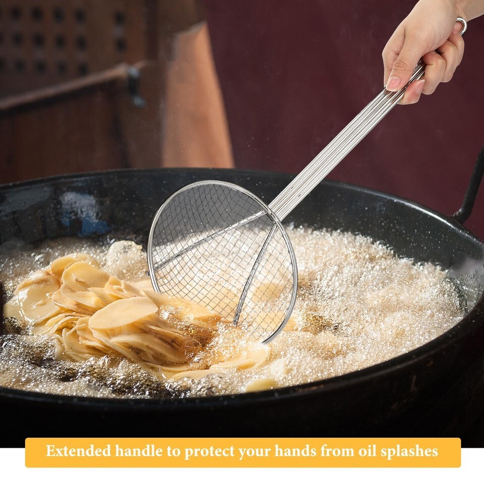 This frying strainer facilitates exceptional draining and straining capabilities. Whether you're making soups, frying foods, or draining pasta, this skimmer can handle it all. Its versatile functionality makes it an essential for kitchen. Specifications: