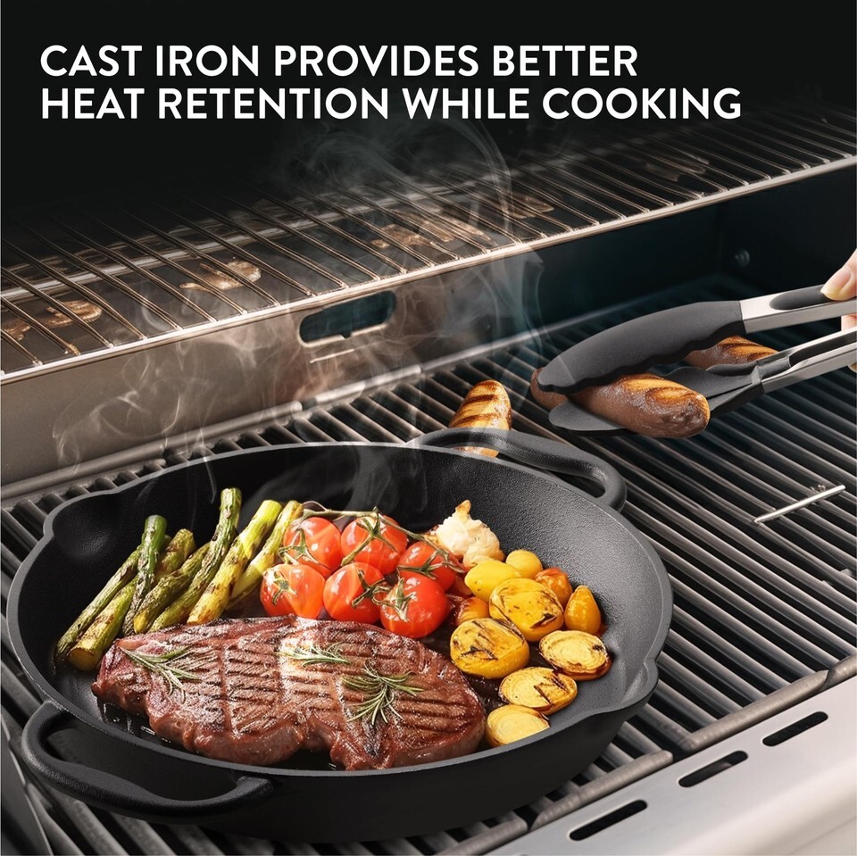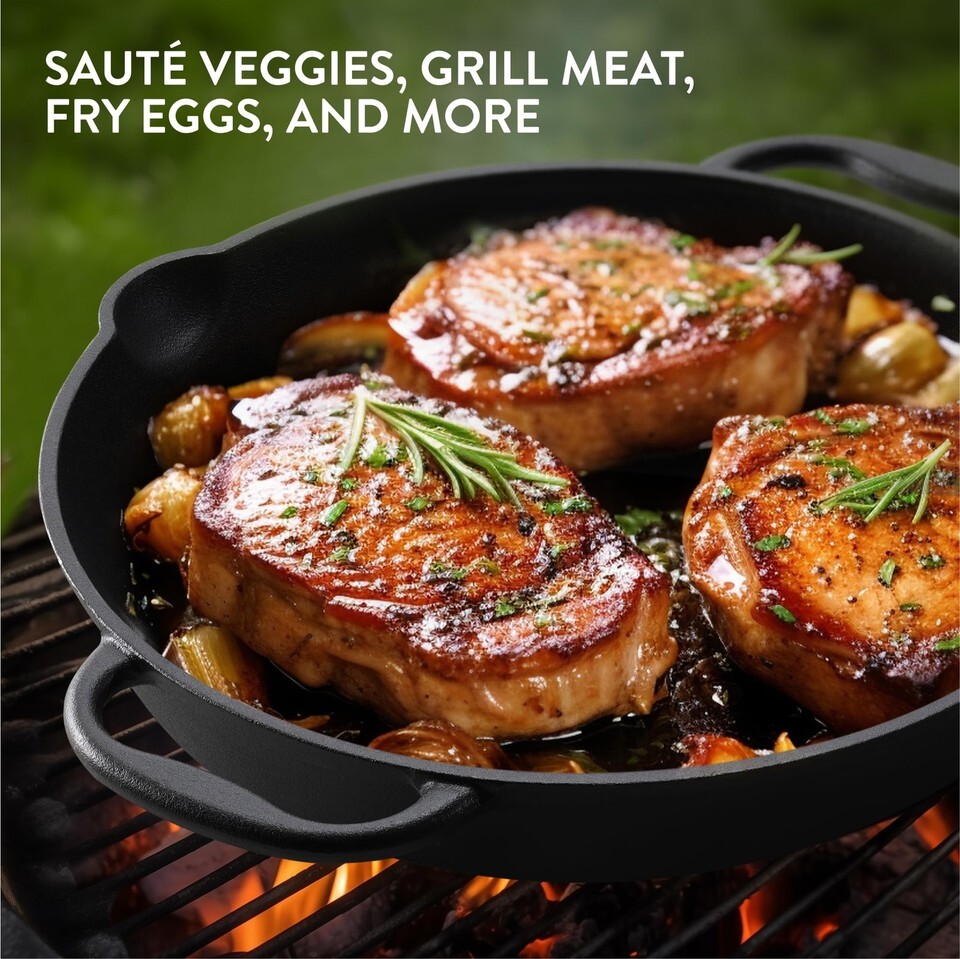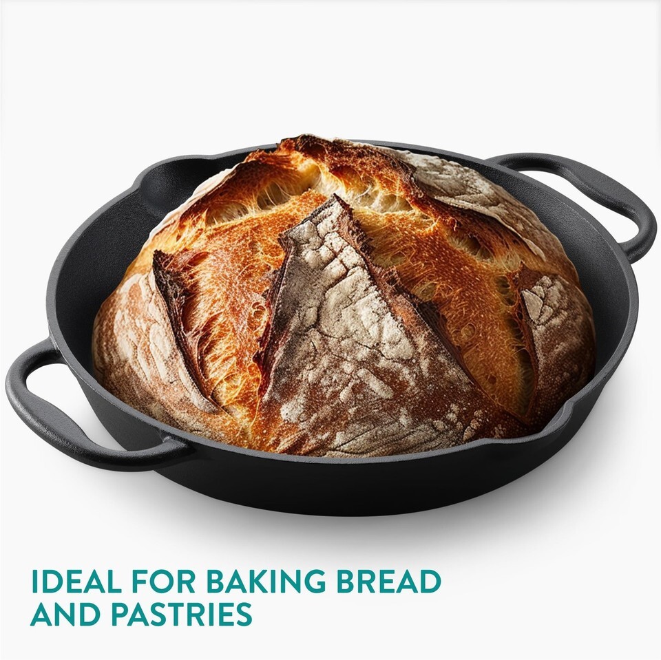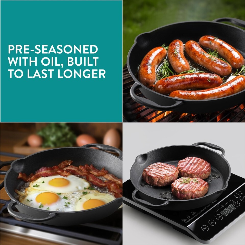 Whether frying, roasting, grilling, baking or saut ing, the pre-seasoned cast iron large skillet from Navaris lets you enjoy a better cooking experience and better results with outstanding retention of heat. Whether on the hob or in the oven, food slides out with ease. With proper care, your pan will last for decades and get better with time.