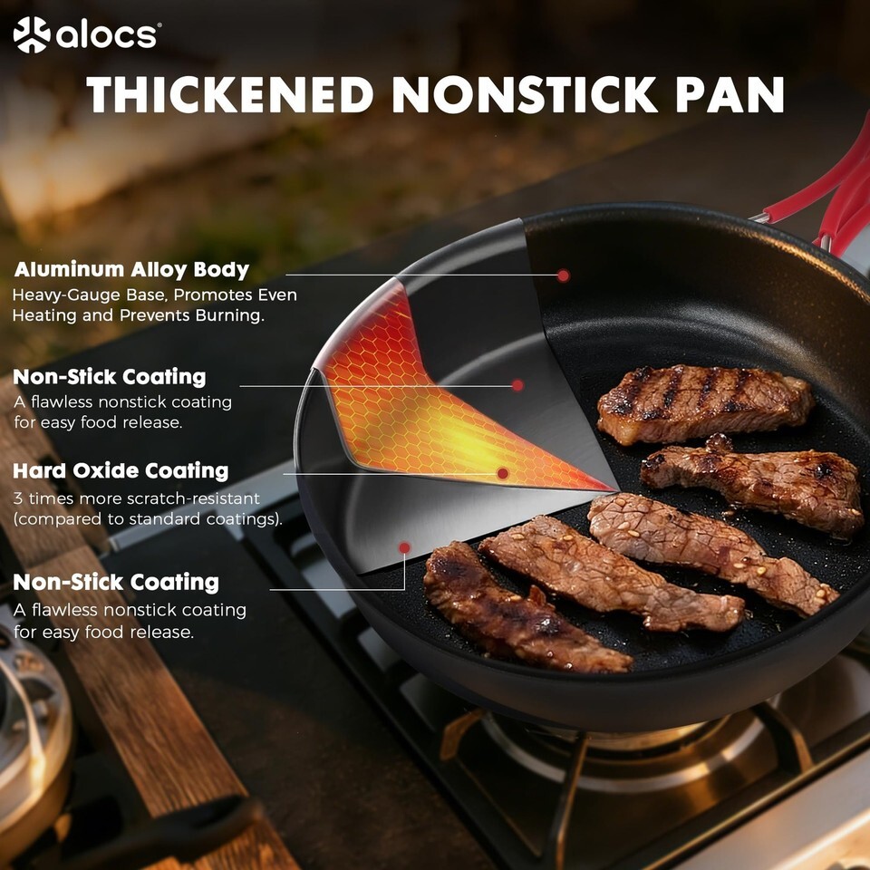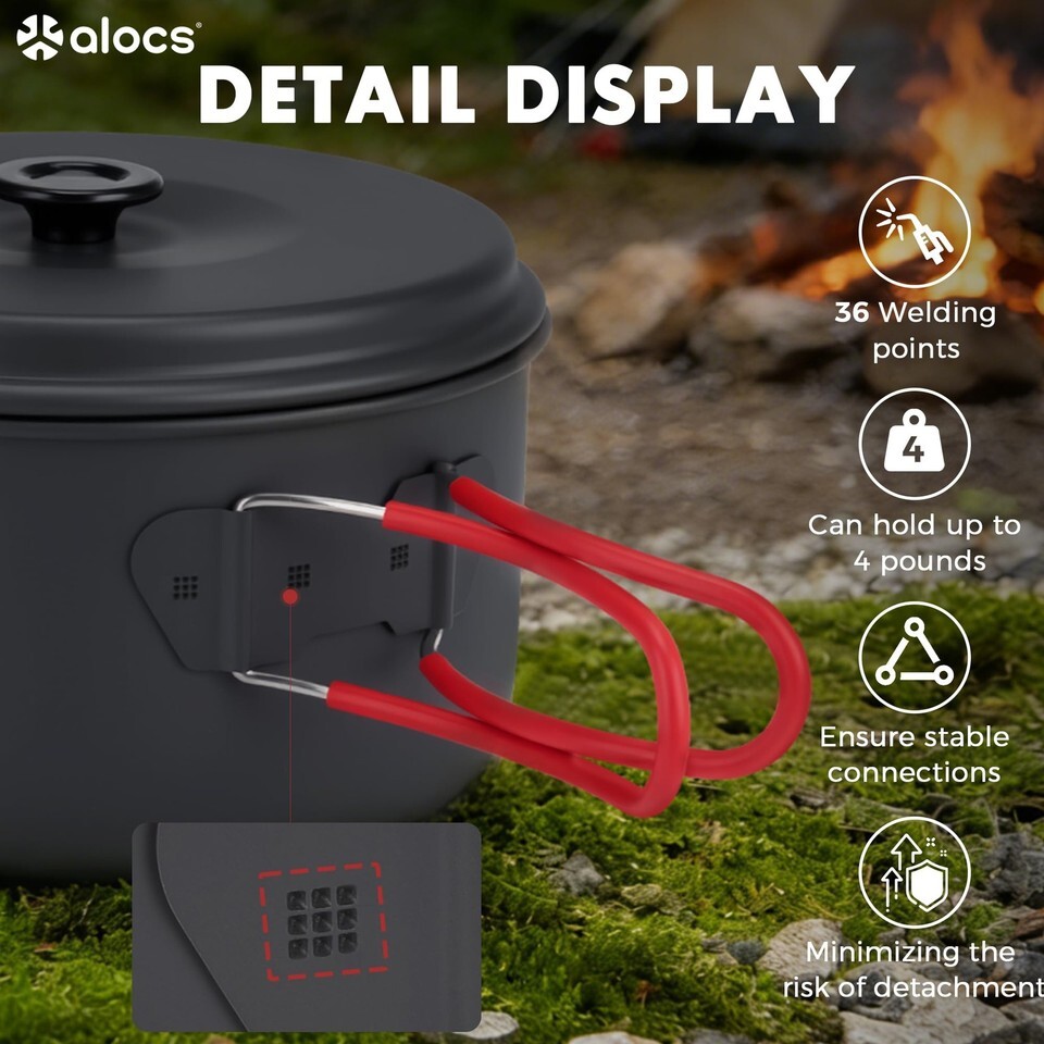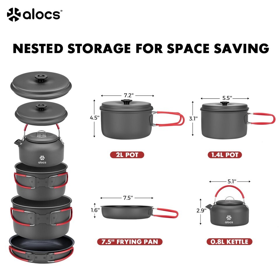 4 IN 1 CAMPING COOKWARE: ALOCS Camping Cookware Set includes: 2.2L pot + 1.4L pot + 0.8L kettle + 7.5-inch non-stick frying pan, providing the perfect setup for 2-3 people. Whether you want to stew, cook rice, fry, or boil water, our camping cooking set has got you covered, ensuring you enjoy delicious meals during your outdoor excursions.,FOOD-GRADE HIGH QUALITY: Our camping cookware is made of high-quality hard anodized aluminum that meets the safety standards of Europe and America, guaranteeing your food's safety and health. Non-toxic, lightweight, resistant to high temperatures, scratches, and corrosion, with high hardness, oxidation resistance, easy cleaning, fast heat conduction, and oil-saving features, this camping accessories set is reliable for outdoor use.,USER-FRIENDLY DESIGN FOR CONVENIENCE: ALOCS camping mess kit is surface-treated with wire drawing and oxidation to enhance its sturdiness and even heating. The silicone handle is heat-resistant and non-slip, designed ergonomically for a comfortable grip, ensuring your safety during use.The lid's steam reflux groove reduces water vapor evaporation, keeping your food moist. The small threaded design on the bottom increases heat efficiency, making your cooking tasks in the wild a breeze.,SAFETY EFFICIENT HEATING: Aluminum boasts better thermal conductivity than iron or titanium, allowing the camping pot heat up quickly and evenly. This not only reduces cooking time but also saves energy and fuel, making your outdoor cooking experience effortless and enjoyable. This camp cooking set is lightweight and durable, making it convenient for your camping trip while also guaranteeing excellent cooking results.,PERFECT GIFT: The lightweight and compact design of Camp Kitchen Set makes it perfect for Mother's Day, Father's Day and Children's Day. This camping essentials is a must-have for any outdoor cooking enthusiast, enjoy at the cookout with the people you love.