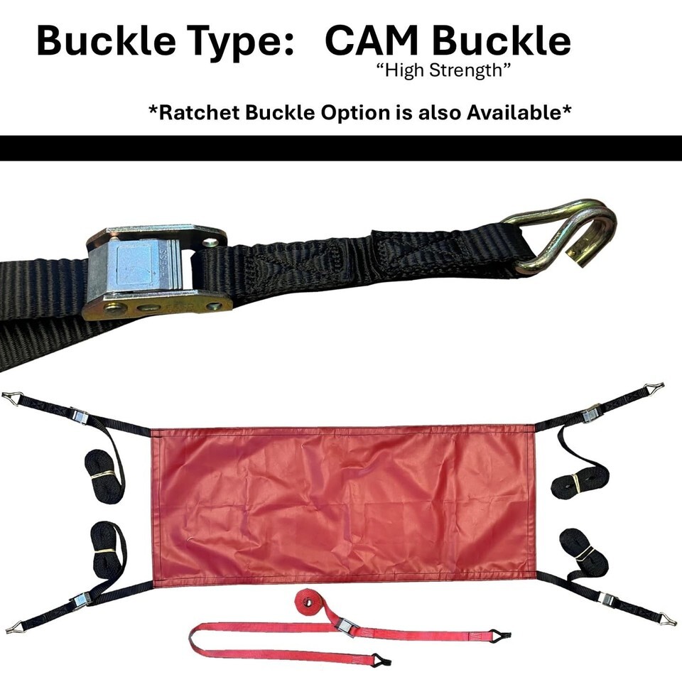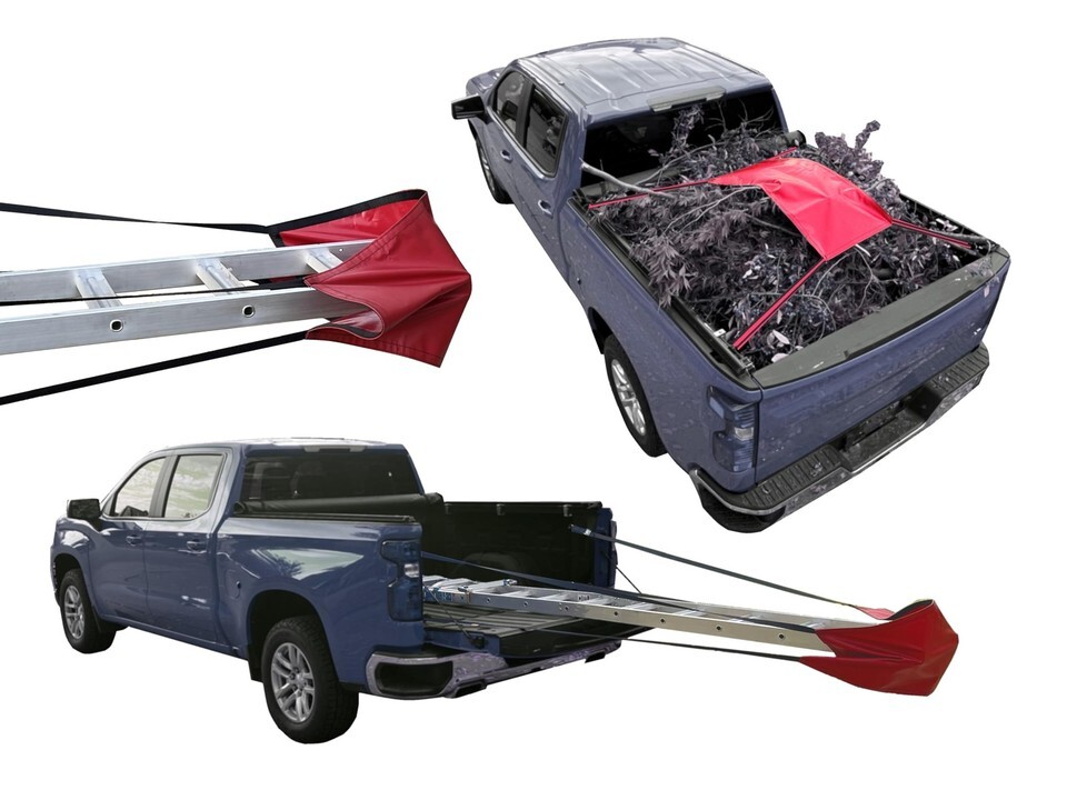 44" x 18" Reinforced Tear/Puncture Resistant PAD | PATENTED,Comes with a Storage Bag Additional 8 ft Tie-Down Strap for Securing Front of Load,4x - 10 ft long Polyester Straps on Pad with 2000 lbs Break Force,Heavy Duty Cam Buckles Hooks,Universal Tie-Down Strap Pad Tailgate Extender/Net,Protective Scratch Damage Resistant Tie Down Strap Prevents damage,Includes BONUS 8 ft strap for securing front of load,Overhanging Load Flag - Secures Acts as a Legal Flag