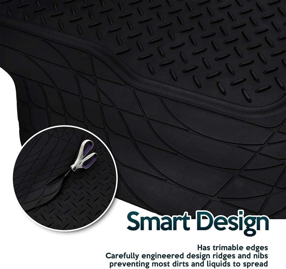 ? PROTECTIVE - The Floor Mat is Lightweight for your convenience The Zone Tech All-Weather Floor Mat provides protection like no other mats do. These mats keep your car floor, particularly your carpets, from accidental liquid spills, snow, mud, dusts, and even germs. The durable channel design keep your all types of dirt isolated from the other parts of your car interior keeping it dry and clean. They are surely perfect especially during a bad weather.,?TRIM LINES ? This mat is designed with trim lines so you can easily trim it for a perfect fit. Our product designers measured multiple vehicles to determine the best combination of ideal fit and indicated trim lines that allow you to make a custom fit, while maintaining the desirable attributes that our customers have come to expect from a Zone Tech product.,? HIGH DURABILTY ? They are made from 100% premium quality rubber with extra thickness. It is almost impossible for this rubber to break or crack. This mat is the mat of choice when you?re for protection that lasts for a long period of time.,? ALL-WEATHER - The Zone Tech car floor mat is waterproof, and stain resistant. With Zone Techs' carefully engineered design ridges and nibs, the floor mat prevents most of the dirt such as mud, snow, water, or debris from messing your car's interior floor.NIBBED NEEDLE BACKING ? This feature enables the mat to stay in place and avoid shifting during harsh conditions. This is also to prevent your people from slipping.,? RIDGES AND CHANNELS ? This mat has tall ridges and channels that are designed to maximize its liquid trapping capacity. They also function to help guide fluids to the lower half of the mat where a reservoir traps fluids and debris - away from your feet and clothes.