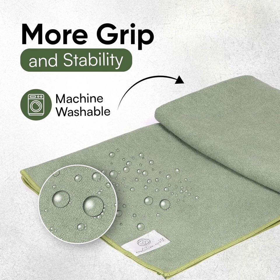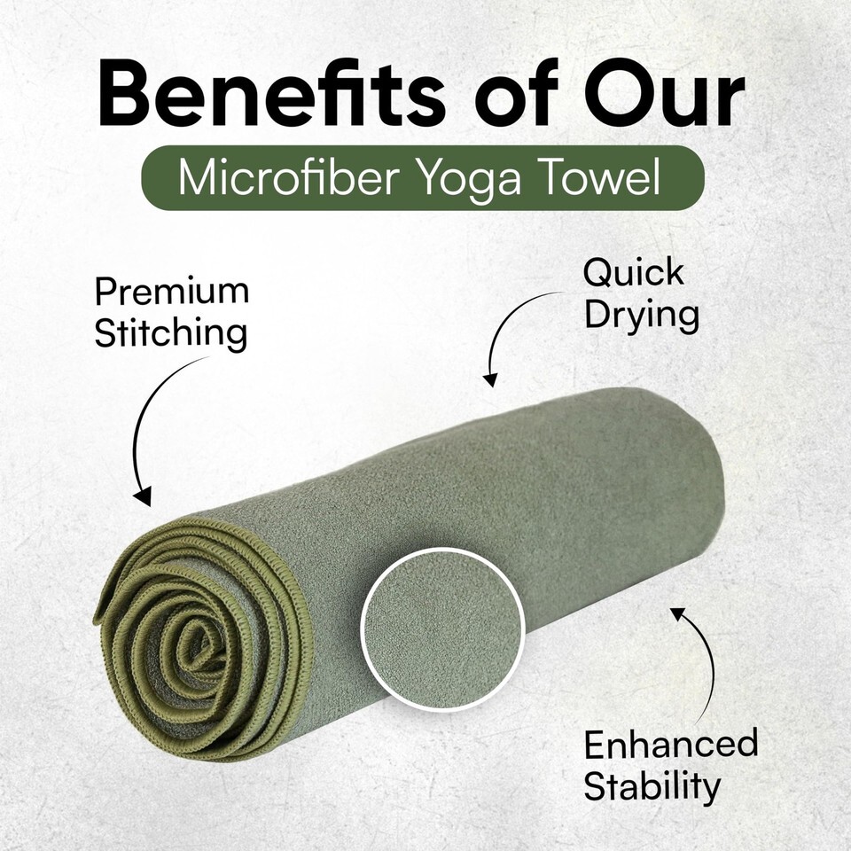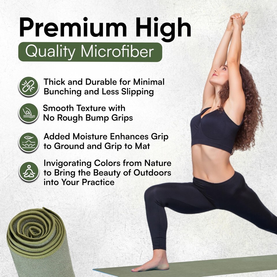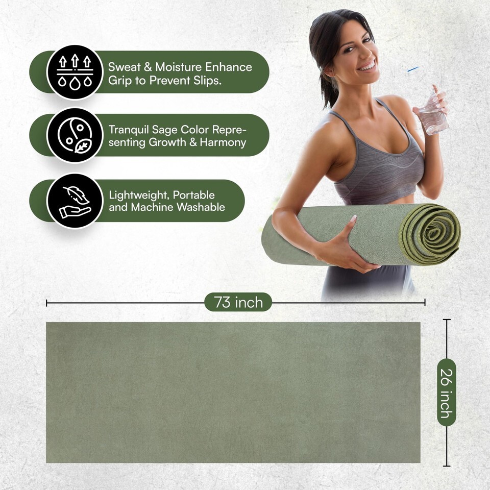 NON-SLIP SKID-LESS YOGA MAT TOWEL: We often practice yoga to help keep us grounded, keep us connected to what matters most, and to also help us cope with the challenges that life brings. This large yoga towel measuring 73? x 26? is offering stability during each yoga session. The non slip yoga towel provides a secure attachment to your yoga mat and grip increases with moisture. The larger size makes a great, easily cleaned yoga mat cover.,Slip-Resistant Material: Crafted from slip-resistant absorbent microfiber, the washable yoga mat towel helps hold to the mat to prevent bunching and also prevents hands from slipping. With an absorbent feature, this yoga microfiber mat provides you with an easy-to-clean feature. Its' made with premium hot yoga towel non slip microfiber.,Durable Soft: Our premium yoga non slip towel is designed with microfiber for a super soft, calming touch. Withstanding daily use, you can frequently wash this fitness towel without compromising its integrity.,Soothing Color: Promoting relaxation and focus, this microfiber yoga mat towel comes the peaceful color of fog. The harmonious color of the large yoga mat promotes a sense of reliability and strength during yoga sessions,Enhanced Stability: The non-slippery material of this workout mat towel offers you a reliable grip. Preventing slipping or sliding during your yoga poses, this aesthetic yoga towel with grip helps to facilitate a worry-free yoga experience.