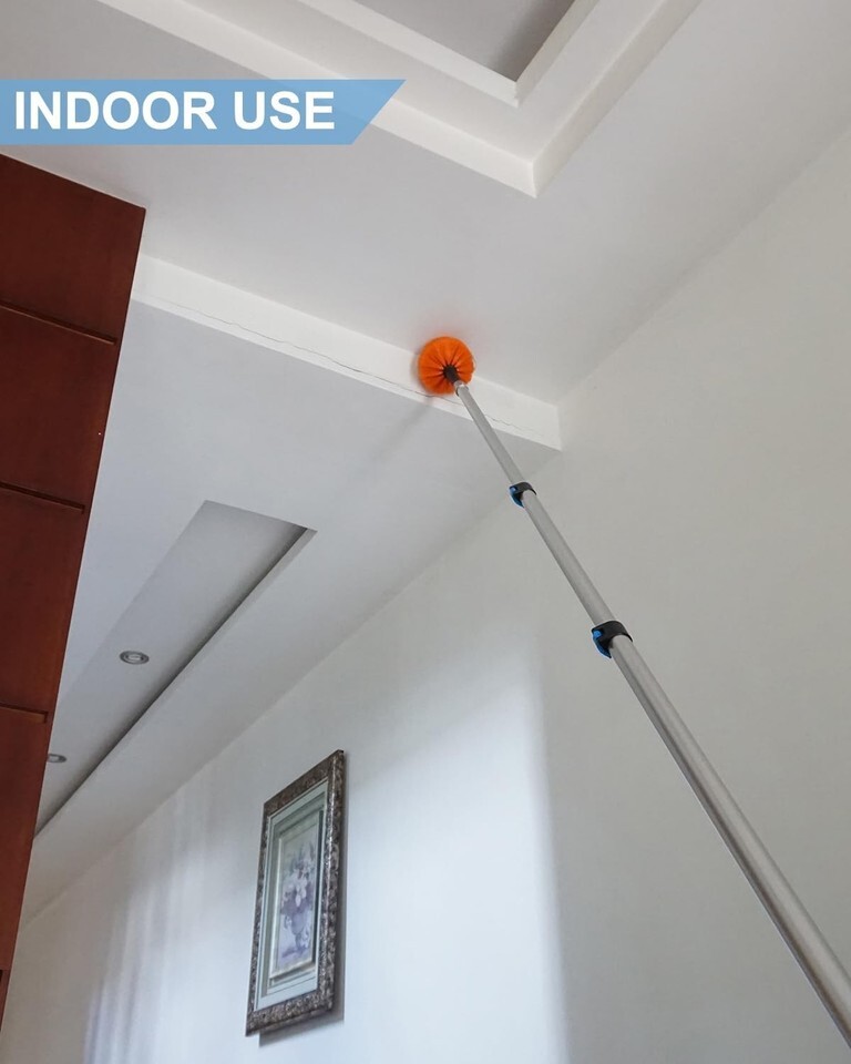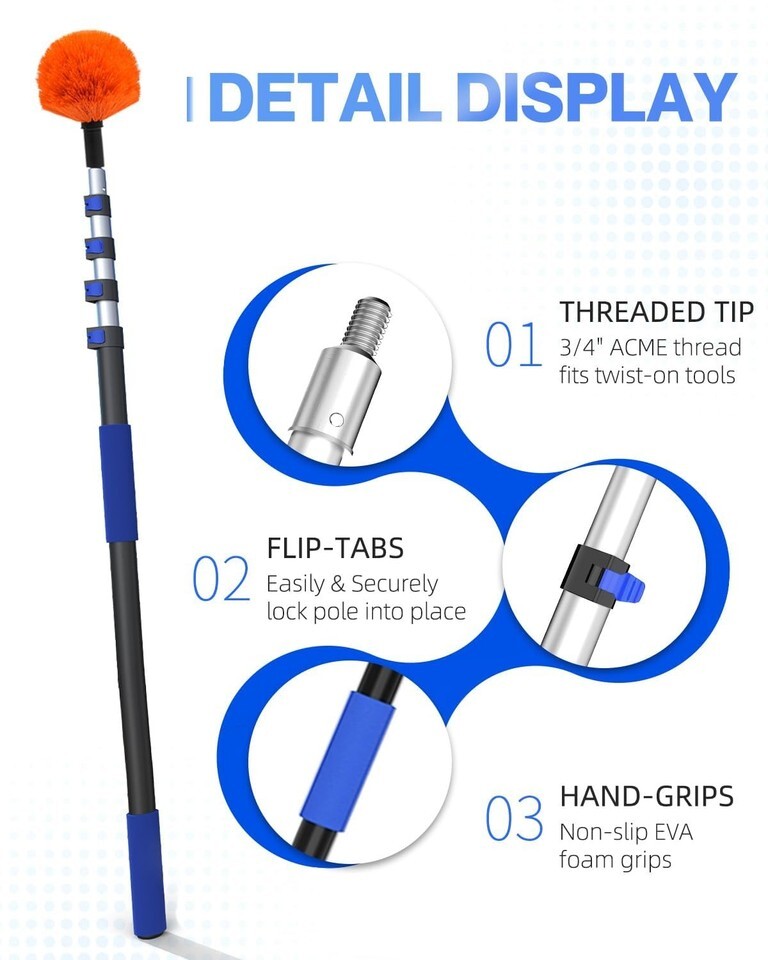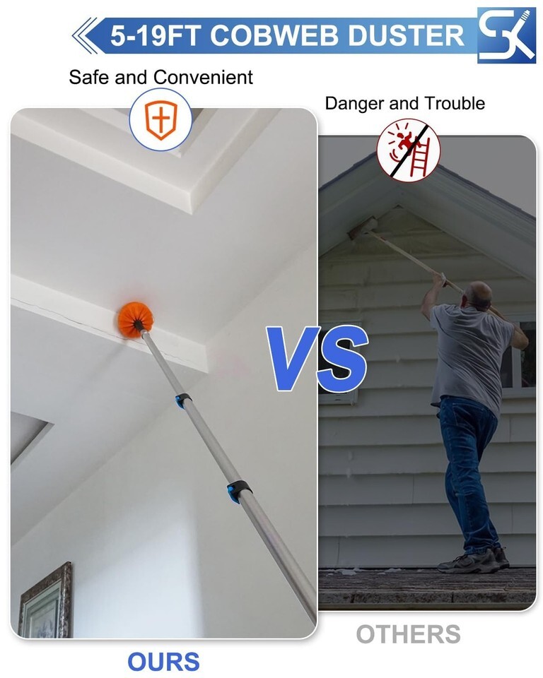 Cobweb Duster Comprehensive Cleaning - The dense bristles of the spider web brush have a certain hardness, which can effectively remove spider webs and dirt in narrow spaces. Even those particularly sticky spider webs encountered outdoors can be easily brushed through every crevice and corner, and easily swept through every area. Cleaning the spider webs and dust on the ceiling becomes effortless.,Reach High Up to 26 Foot - SKGPOLE 5-19ft cobweb duster telescopic extension pole with 3/4" American standard thread, can reach a length of up to 26 foot when fully extended. The 4 flap locks on the extension pole are used to freely adjust to any length and height you want and lock it in place. Perfect for cleaning tall, hard to reach spots inside and outside: high ceilings, corners, walls, and more!,High Quality and Durable Materials - The telescopic pole is made of high-quality aluminum, making it very sturdy and durable, and will not break or bend when fully extended. Anti slip foam grip provides a more comfortable, stable and reliable grip. Cobweb duster brush head can be cleaned and reused multiple times. After completing the cleaning task, simply rinse with warm or cold water in the sink and let it dry.,Twist-on Cobweb Duster - You can easily clean cobwebs, walls, baseboards, ceiling fans, cabinets, corners, floors, under counters with it. The proper contour shape and soft bristles remove dust and cobweb in the corners to protect the surface from scratches. The medium stiff bristles spider web brush has a standard universal threading that can be easily twisted on any pole.,We provide up to 1 year warranty service. If you have any questions or suggestions, please let us know.
