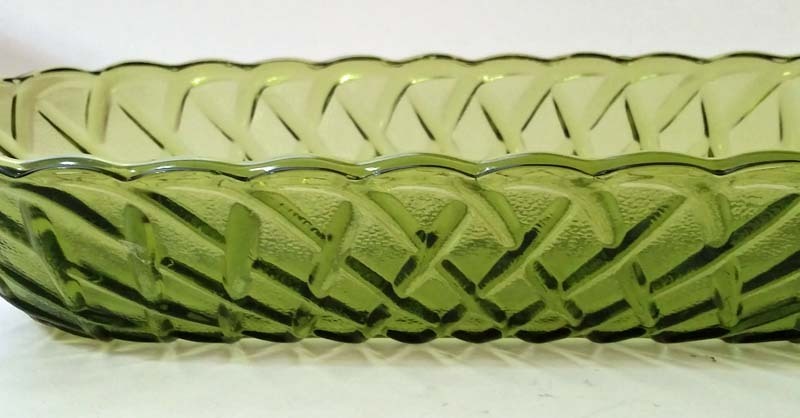 Depression Indiana Glass Basket Weave Avocado Green Celery Relish Dish 1960's