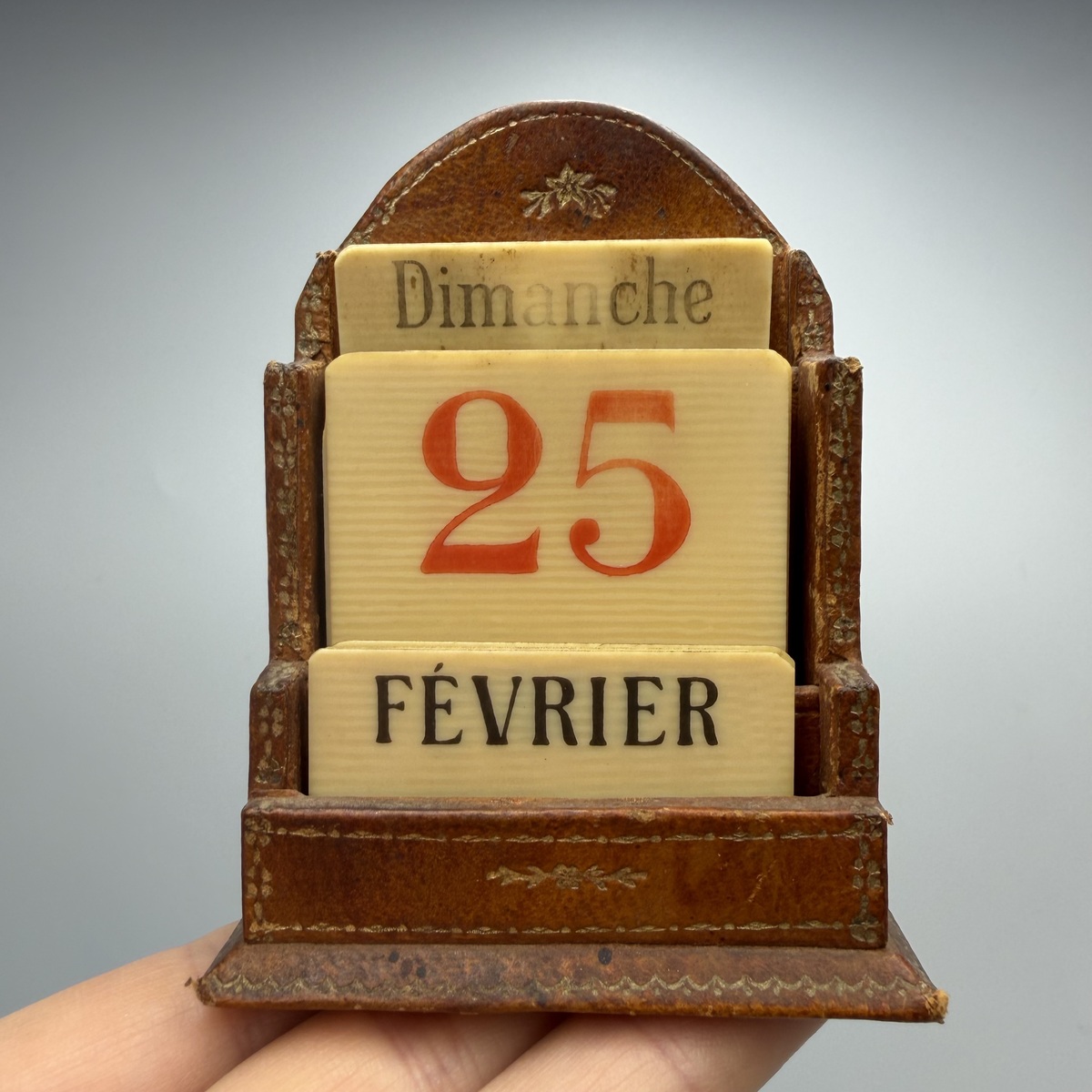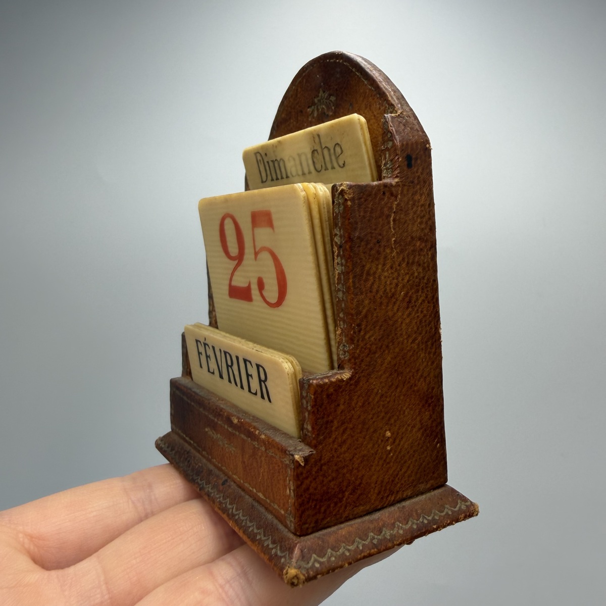 This charming antique perpetual desk calendar is a rare and elegant decorative piece, combining functionality with timeless European craftsmanship. Designed for manual date adjustment, it features interchangeable plaques for days, dates, and months, all neatly housed in a compact leather-covered wooden stand.