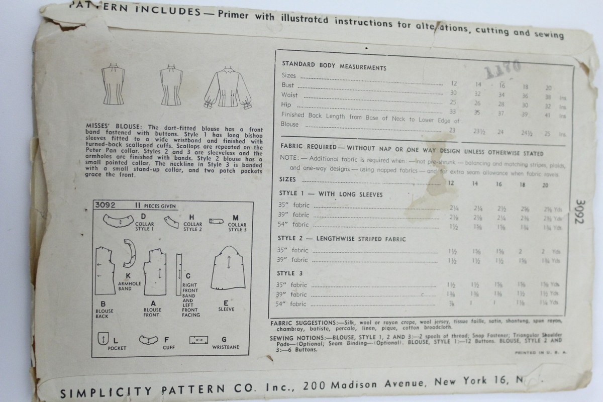 VTG 1949 Sewing Pattern Simplicity #3092 Size 14 Bust 32 Womens Blouse Guernsey