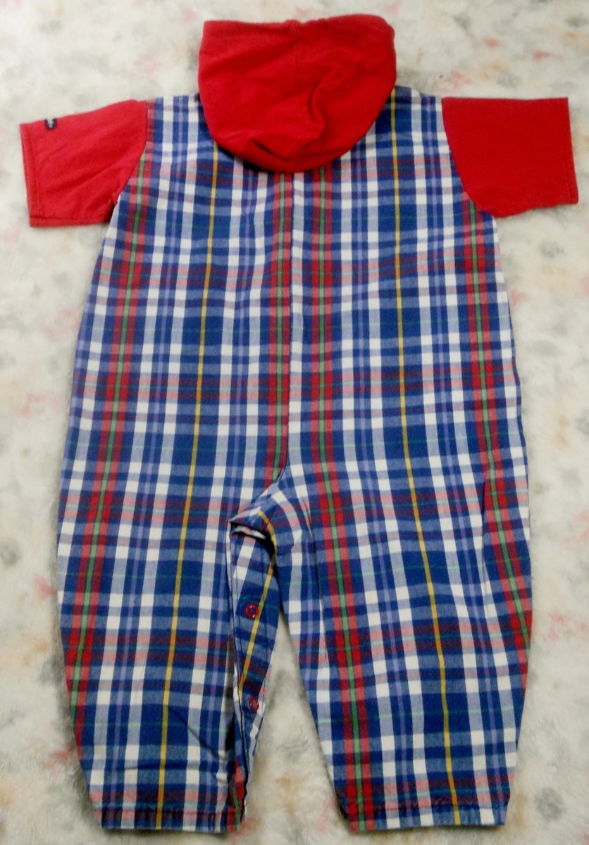 OshKosh B’Gosh MADRAS Hoodie Coveralls plaid Cotton/red hood Sz 18mos-Vintage