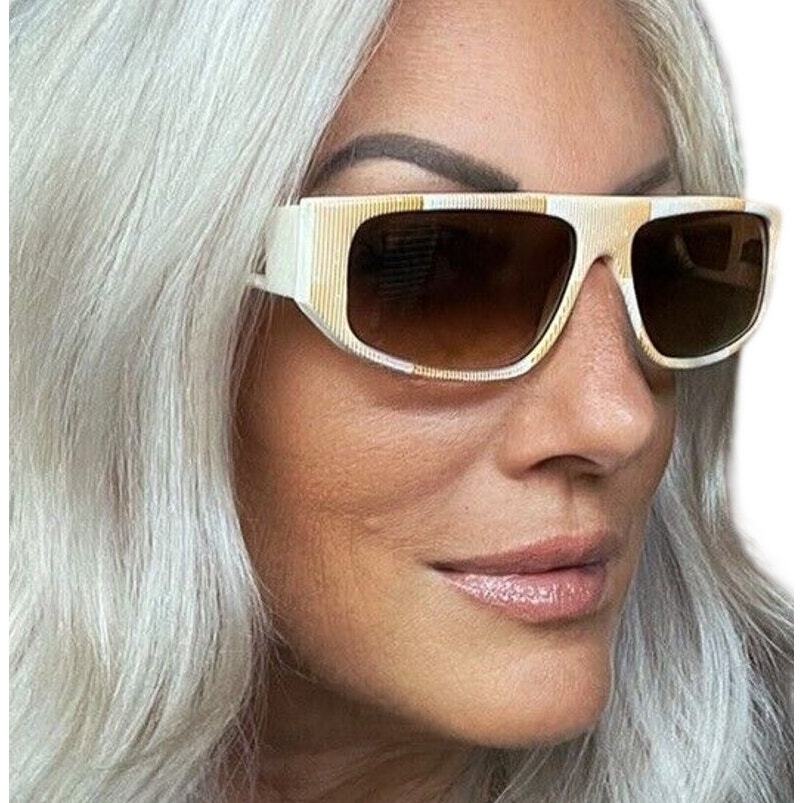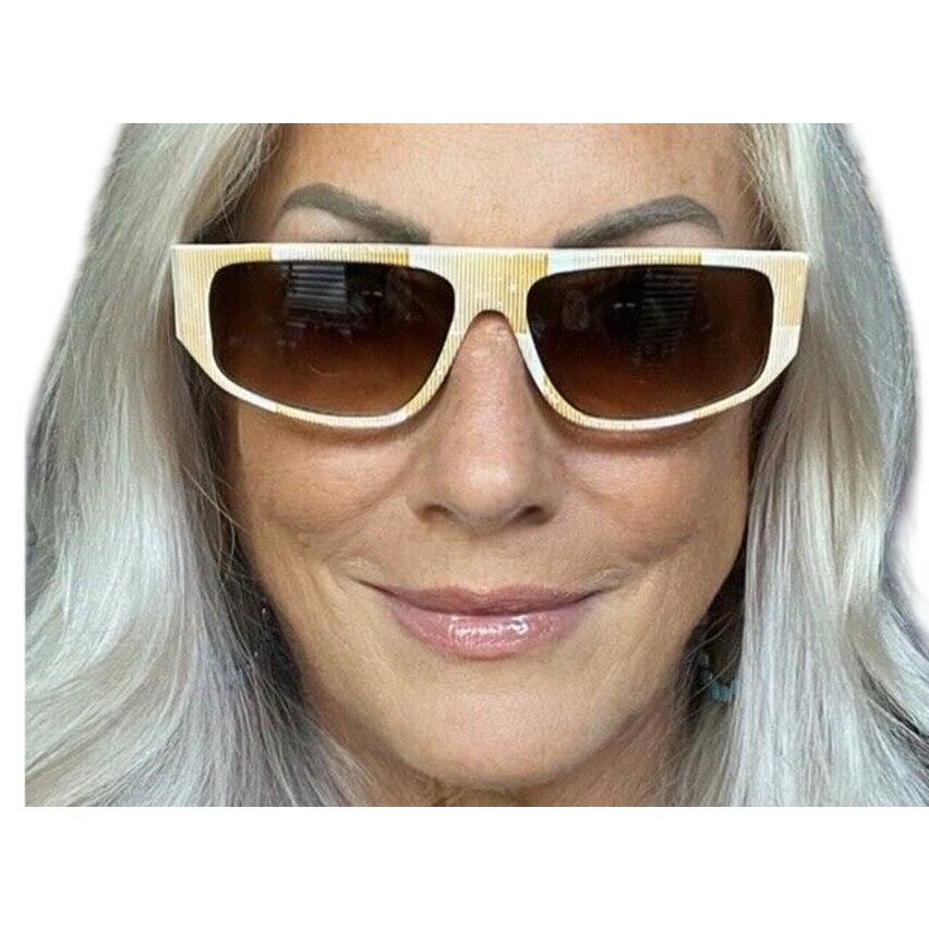 What you?ll love about these vintage 1970s sunglasses is the bold, architectural frame paired with creamy white acetate featuring a stripe detail and warm brown gradient lenses?pure Studio 54 meets Palm Springs glamour. The oversized proportions and sculptural temple cutouts embody authentic 1970s luxury eyewear design, created to command attention and flatter larger face shapes beautifully.