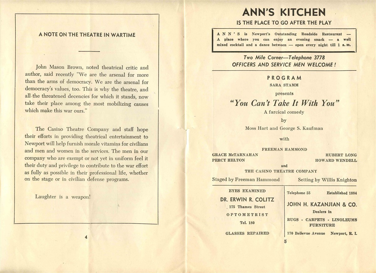 Casino Theatre Program Newport Rhode Island 1943 You Can't Take It With You
