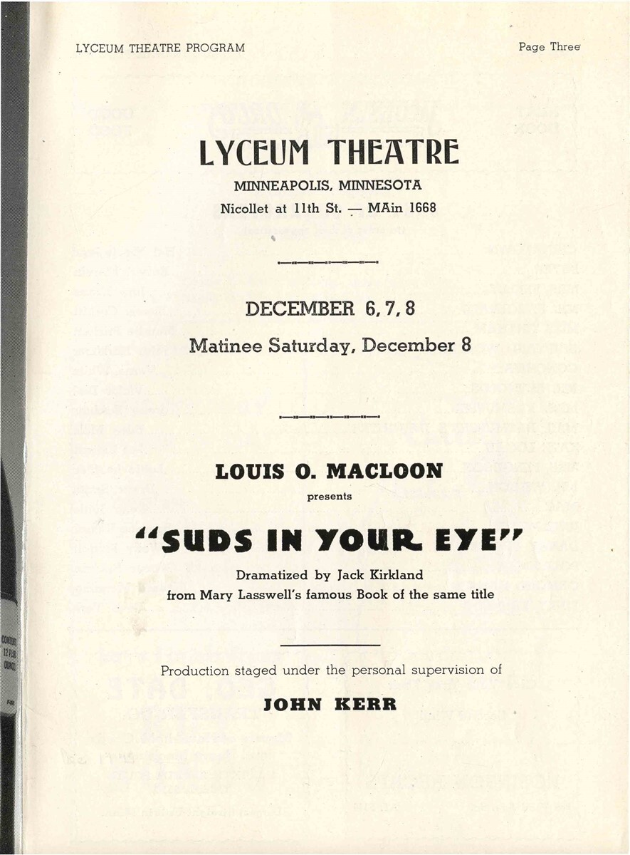 Suds in Your Eye Lyceum Theatre Program Flyer Minneapolis Jan Erhard 1945