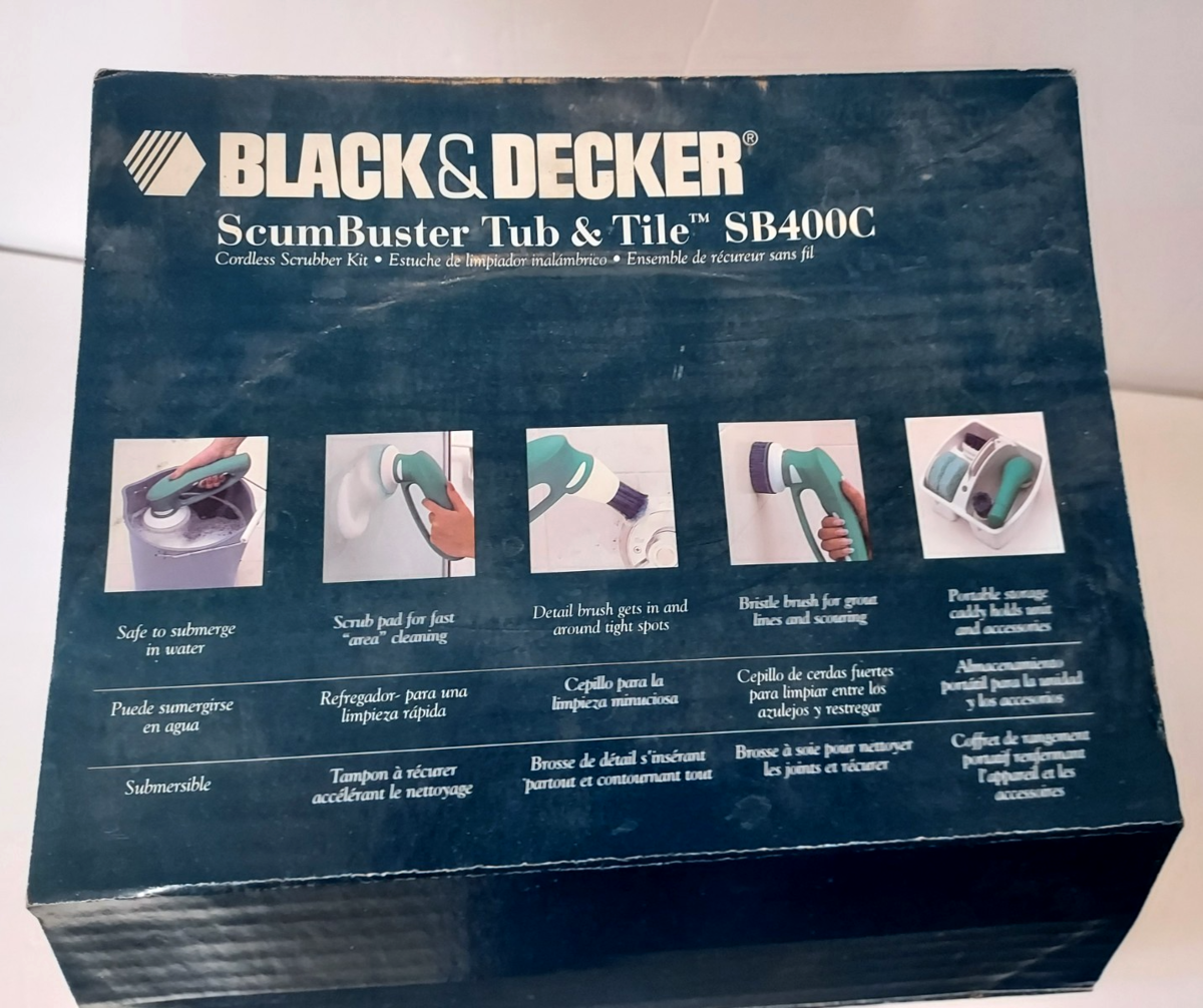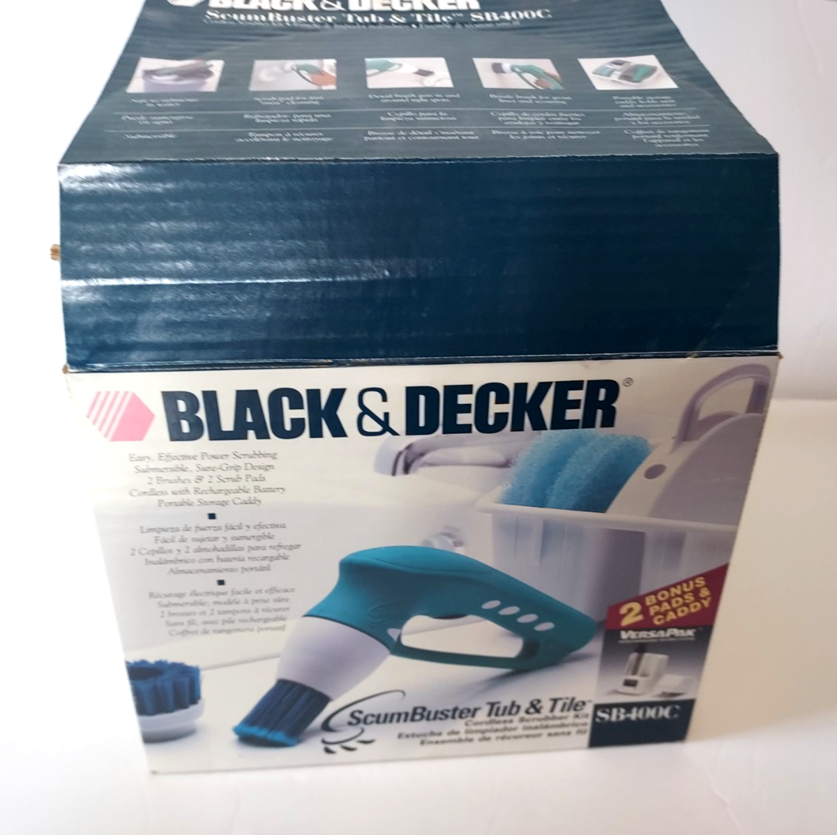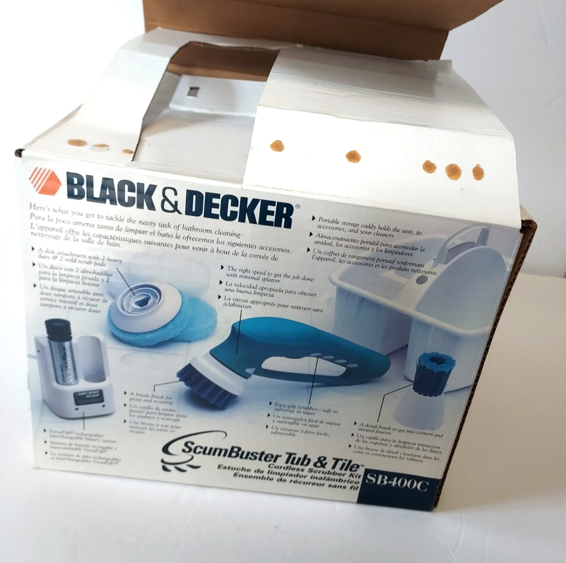 The Black Decker ScumBuster cordless tub tile scrubber is extra tough on lime scale soap scum but gentle on your fixtures you. Powered by rechargeable/interchangeable VersaPak batteries, it performs major bathroom scrubbing delivers sparkling results. It features submersible rubberized housing 3 versatile attachments: a wide area scrub pad for sinks, tubs, tile surfaces; a detail brush for fixtures tight areas; a bristle brush for grout lines.