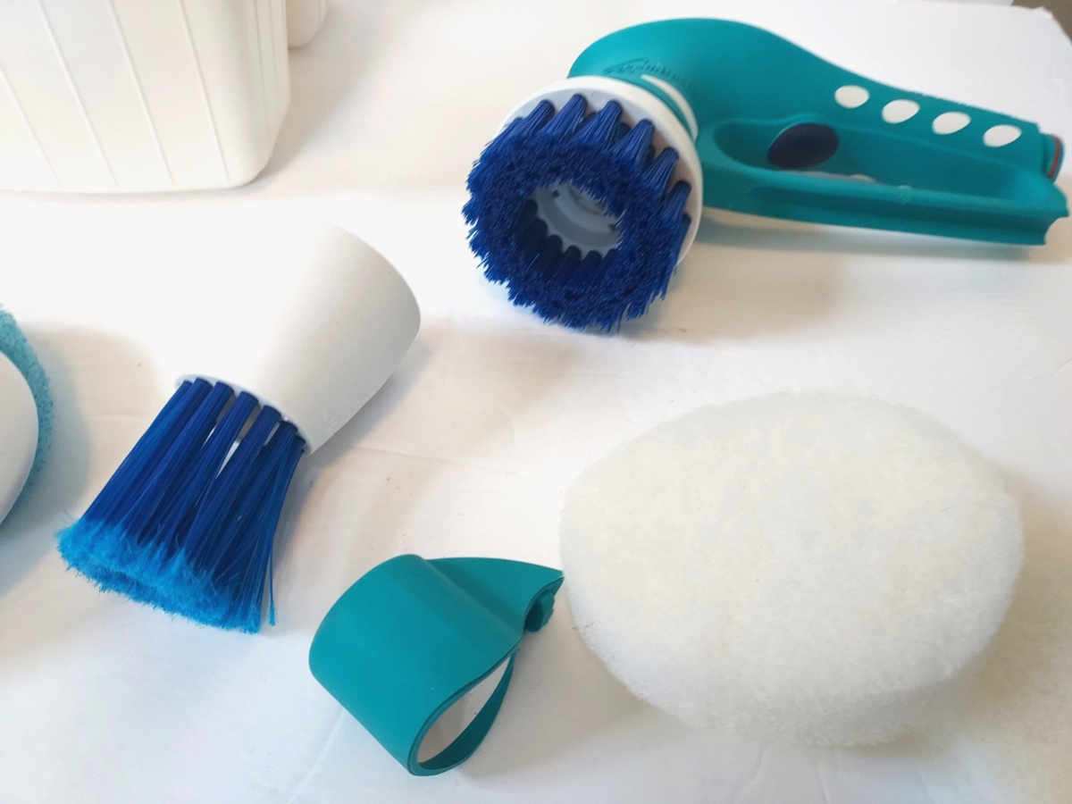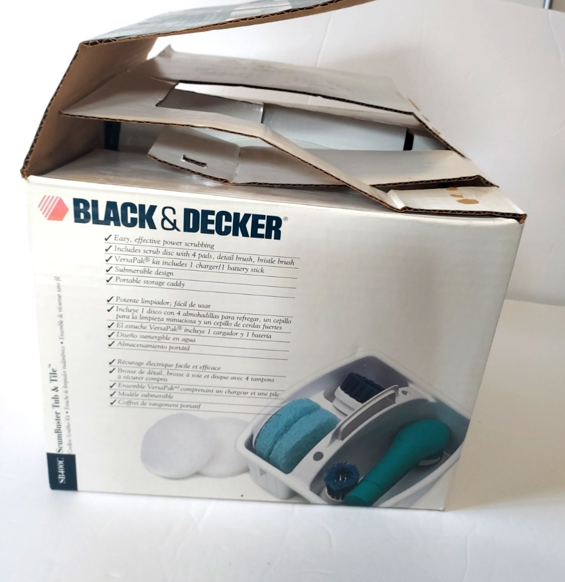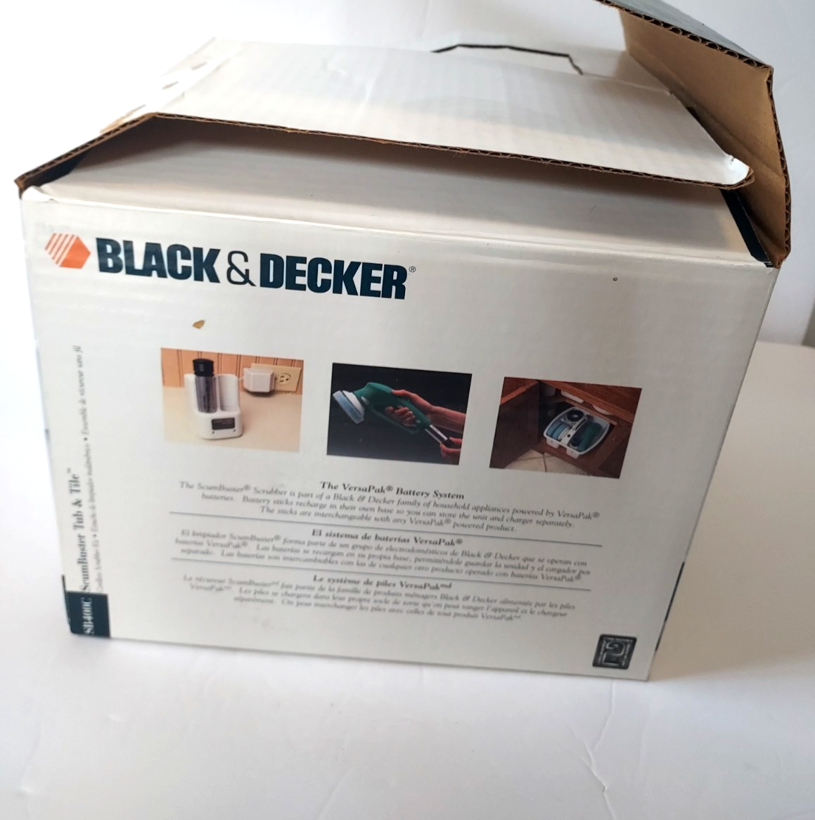 The Black Decker ScumBuster cordless tub tile scrubber is extra tough on lime scale soap scum but gentle on your fixtures you. Powered by rechargeable/interchangeable VersaPak batteries, it performs major bathroom scrubbing delivers sparkling results. It features submersible rubberized housing 3 versatile attachments: a wide area scrub pad for sinks, tubs, tile surfaces; a detail brush for fixtures tight areas; a bristle brush for grout lines.