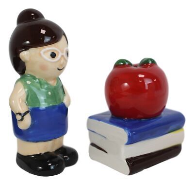 Ceramic Lady School Teacher And Red Apple Books Salt Pepper Shakers Figurine Set
