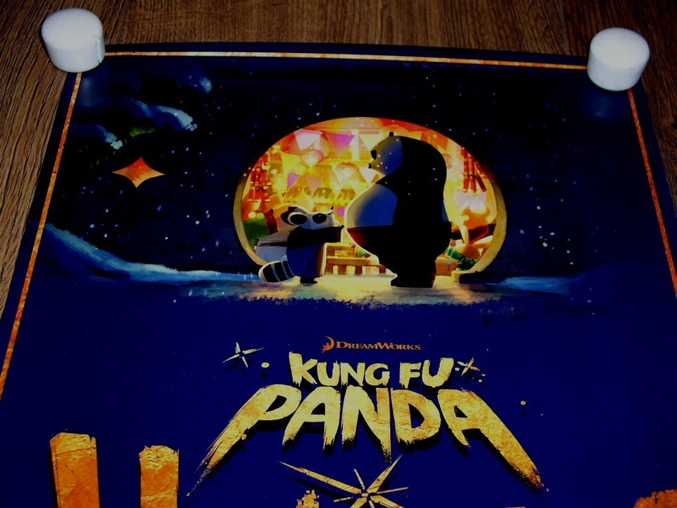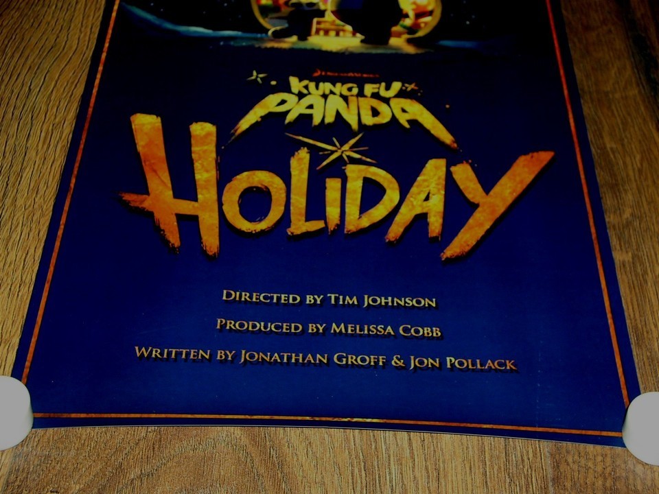 This is a vintage poster print entitled, "Kung Fu Panda Holiday". A terrific item for the fan or collector. This is assumed to be the original, promotional, larger size than the single sided reproductions. Printed on glossy paper. It is undated and has no company information on it.
