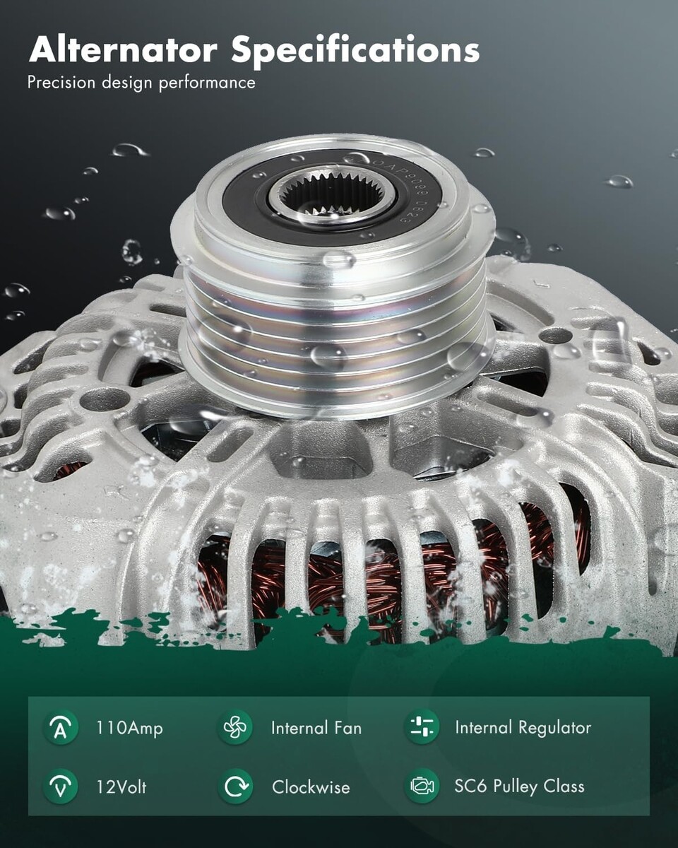 ?Alternator Specifications? - 110 Amp/12 Volt,CW,SC6 Pulley Class,IR/IF, high output alternator is compact and lightweight, fully compatible with the electronic system of your vehicle.