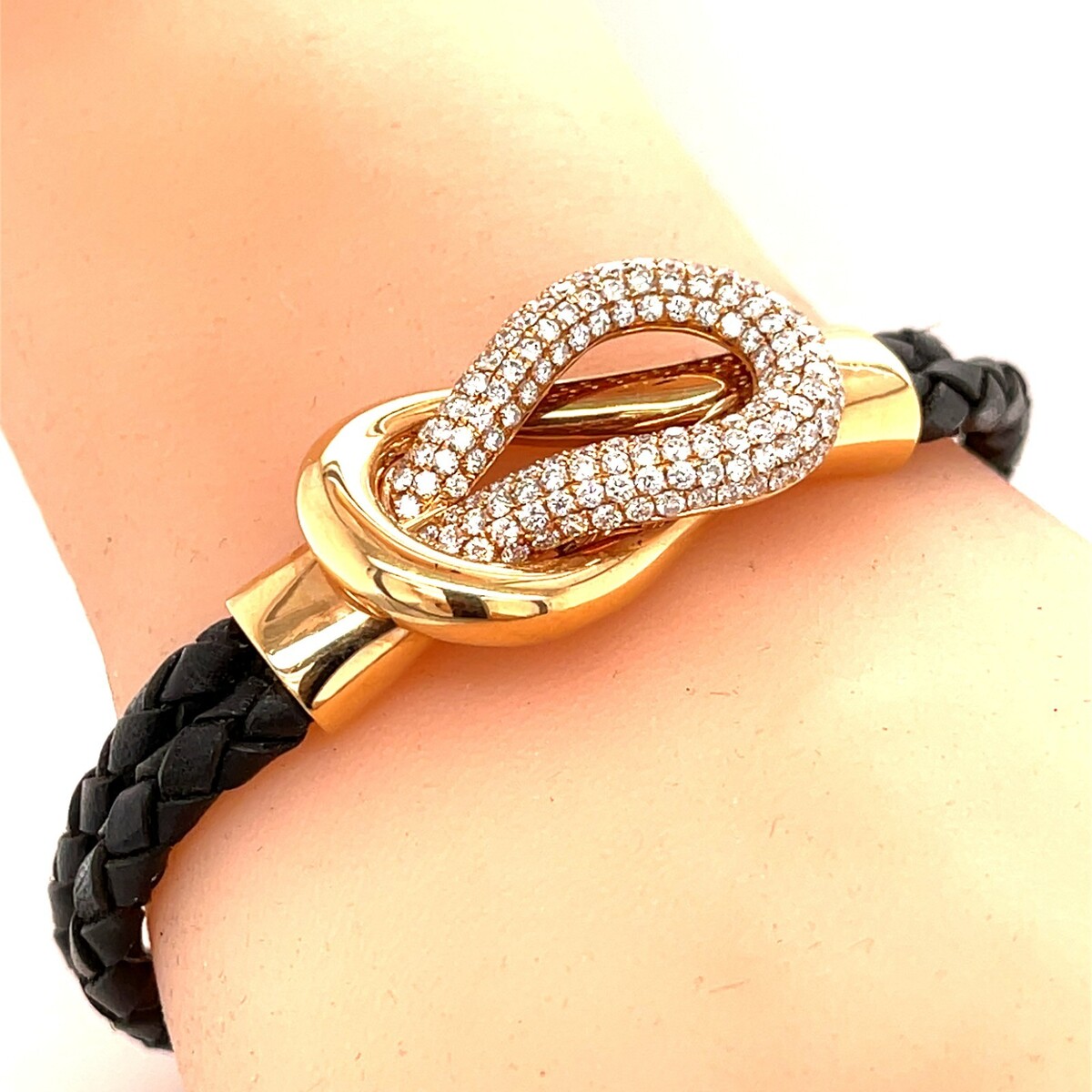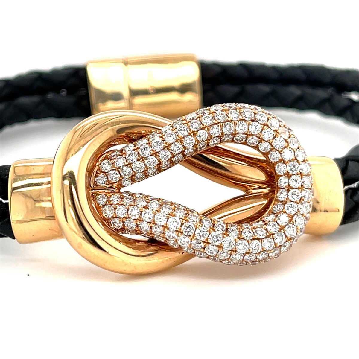 Features Double Braided Leather Strands Supporting "Square Knot" Made of 18k Rose Gold