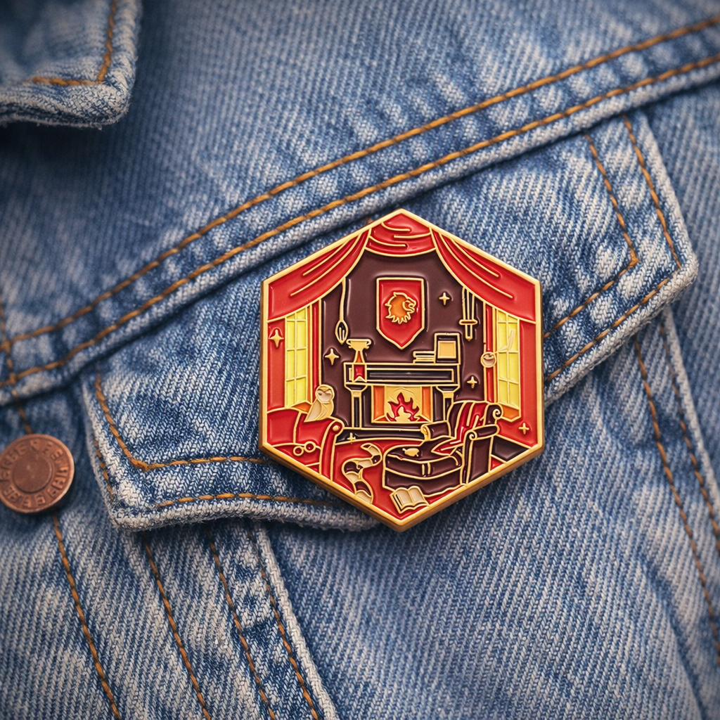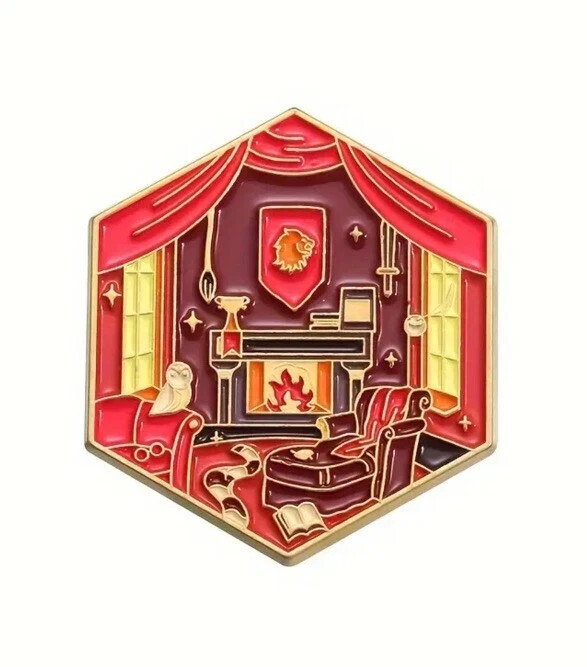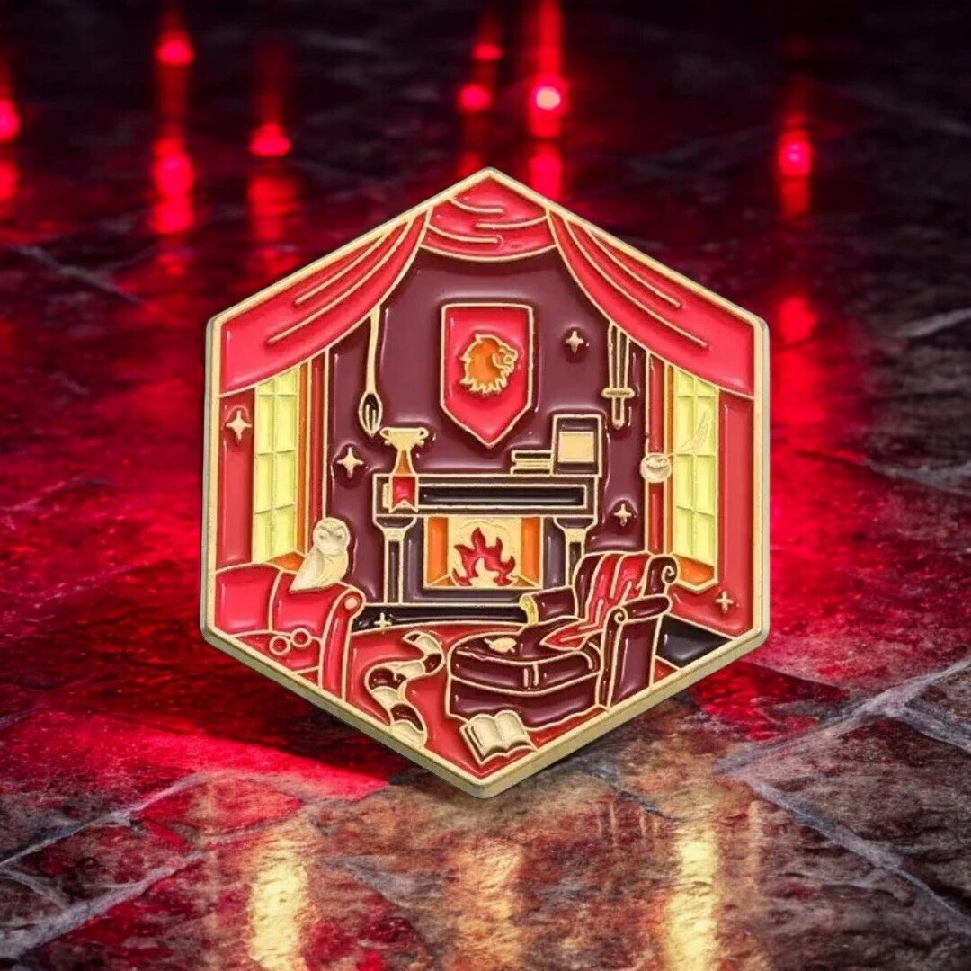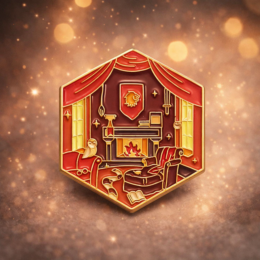 Step into the magic of the wizarding world with this extra-large fantasy enamel pin inspired by the iconic Gryffindor common room. Designed in a detailed hexagonal shape, this collectible pin features rich colors, gilded metal lines, and a cozy enchanted study scene that instantly evokes the look and feel of a classic wizard house dorm. Fans of spellbooks, roaring fireplaces, house banners, and late-night study sessions at a certain British wizarding school will recognize the aesthetic immediately.
