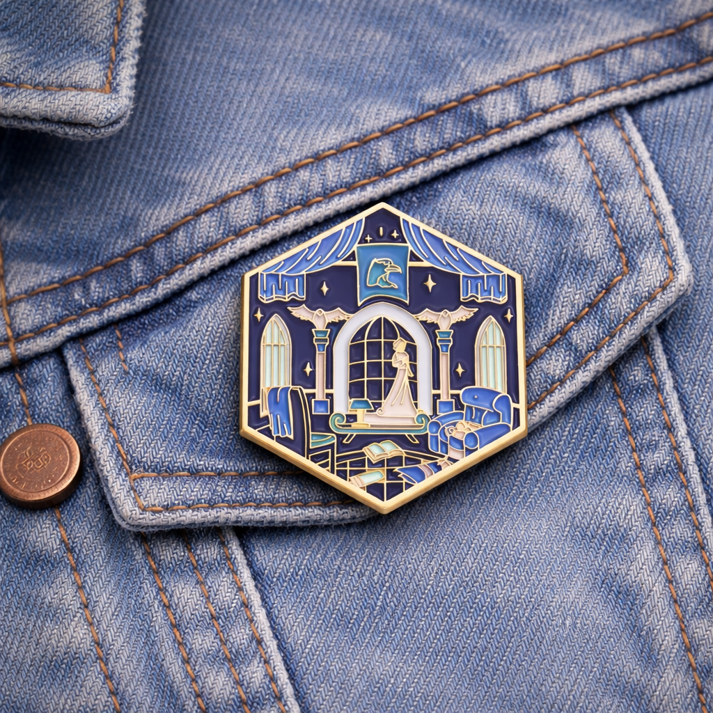 Step into the enchanted world of wisdom, wit, and creativity with this extra-large fantasy enamel pin inspired by the Hogwarts Ravenclaw common room. Designed in a striking hexagonal shape, this pin showcases a dreamy midnight-blue study filled with arched windows, floating stars, spellbooks, and elegant house decor ? capturing the serene, scholarly aesthetic of the cleverest wizarding house.