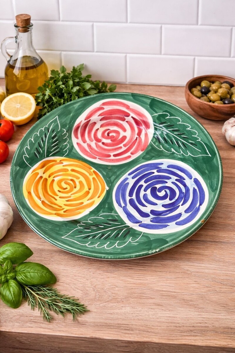 Large 13 inch hand painted ceramic platter made in Italy exclusively for Pier 1 Imports. Features three bold spiral florals in red, yellow, and blue against a rich green background with stylized leaves. A vibrant Mediterranean-inspired serving piece perfect for entertaining, display, or wall decor. Back stamp reads: Handpainted Exclusively for Pier 1 Imports, Italy. Handwashing recommended.