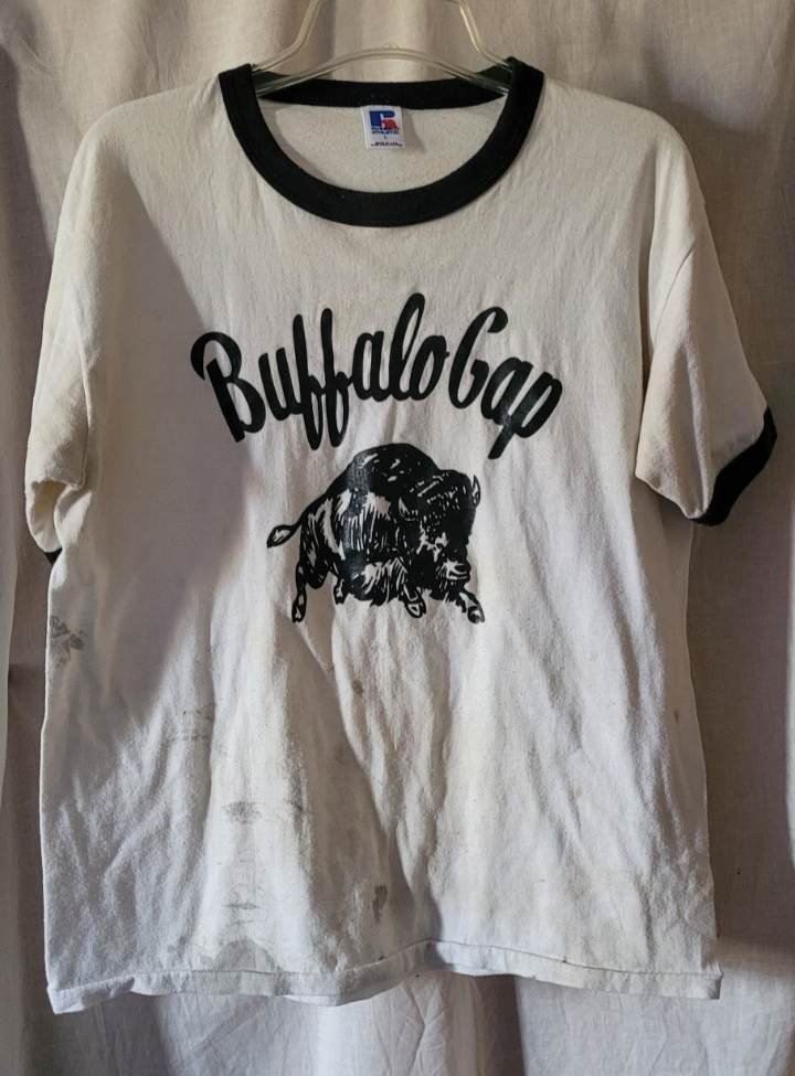 As seen in the photos this t-shirt is in fair condition. There are many stains. Not sure if it was bleached if they would come out. The print could be cut out and made into something like a pillow cover, quilt, seat cover, etc. The size is XL. Measurements are approximately: Length: 27 inches. Pit to Pit: 22 inches.