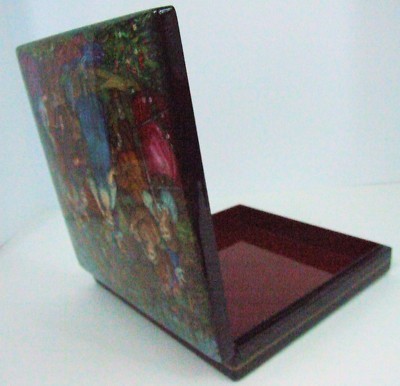 This five sided box consists of many layers of pain staking brush work applied using the finest of brushes. The artist paints the picture in layers. Between each layer, she applies a coat of lacquer. The first layer is a base color of the painting. The second layer adds more colors. The third and successive layers add more and more colors and details until the picture is complete. Usually, there are four or five layers. After the painting is complete several coats of lacquer are applied.
