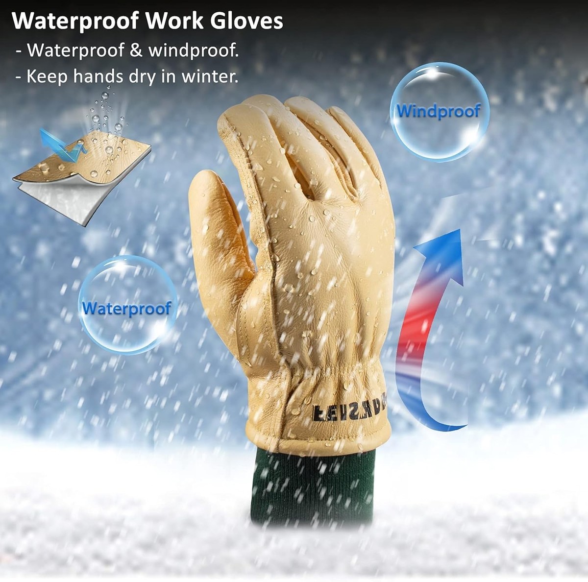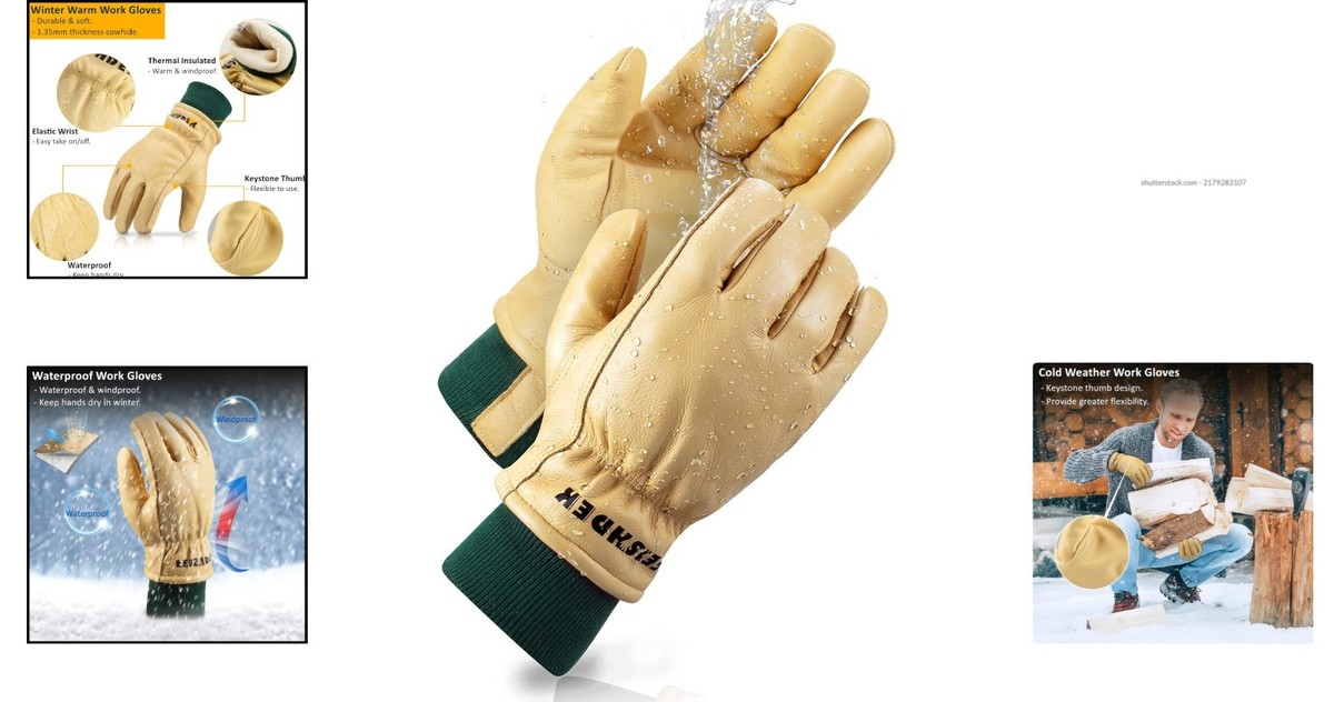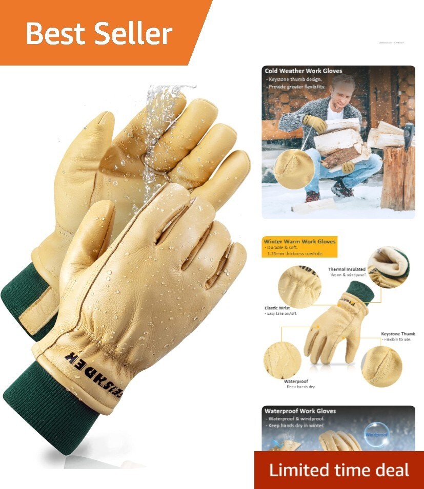 Winter Waterproof Cowhide Leather Work Gloves for Men - Insulated Warmth