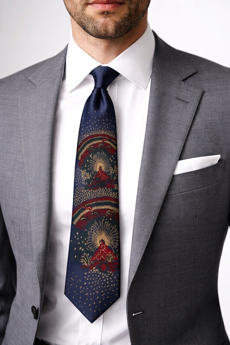 Elegant vintage Valenti Neckwear Co tie featuring an intricate scenic motif with fan and landscape elements. Crafted from imported Italian silk and made in the USA, this statement accessory blends classic craftsmanship with artistic design. A standout piece for collectors, formal wear, or distinctive styling.