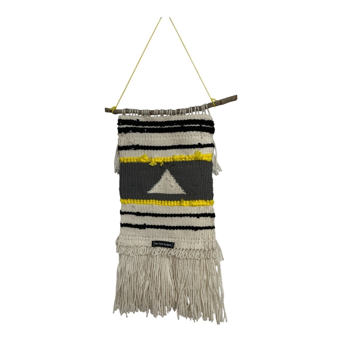 Artistic handmade woven wall hanging by The Yarn Sculptor featuring a textured boho design with layered fringe, geometric triangle motif, and contrasting stripes. Mounted on a natural twig rod with hanging cord, this piece blends organic elements with modern textile art styling. A striking accent for boho, minimalist, or eclectic interiors.
