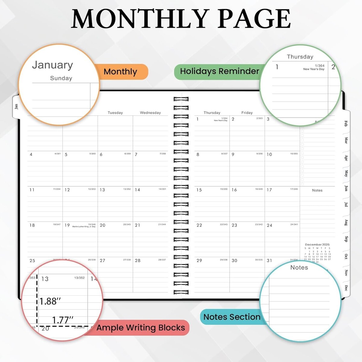 Spacious unruled daily blocks (1.88? x 1.77?) for seamless monthly planning.
