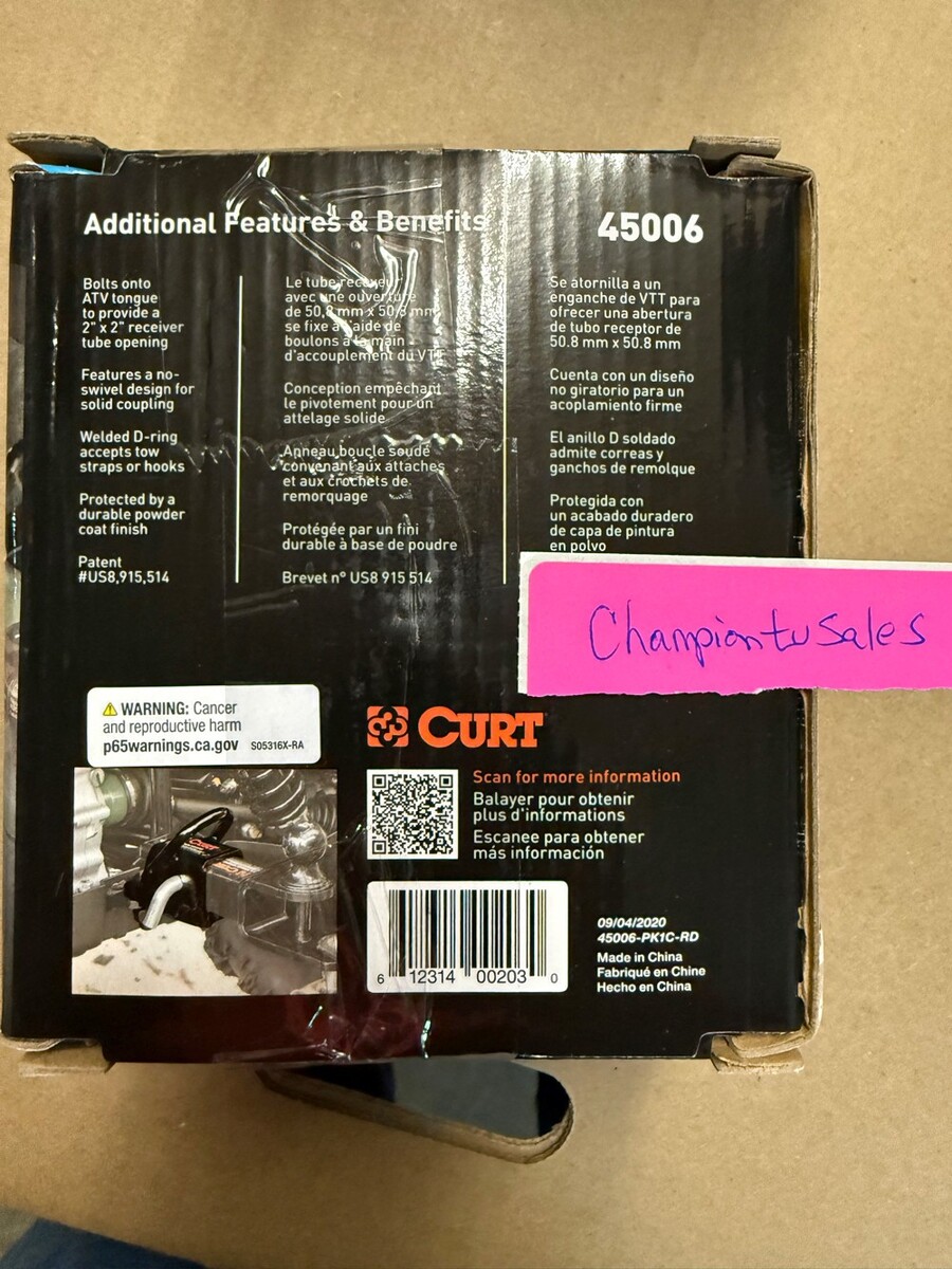 The CURT 45006 Bolt-On ATV Tongue Adapter is a durable and reliable towing accessory designed for ATVs. Made with a gloss black powder coat finish, this adapter is built to last and withstand tough use. Manufactured in China, this adapter is compatible with 2" receivers, providing a secure and stable attachment for towing purposes. Perfect for those looking to tow trailers or other vehicles with their ATV, this CURT adapter offers a high-quality solution for your towing needs.