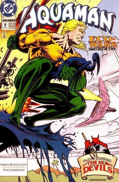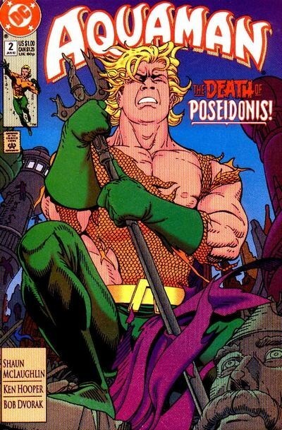 *Aquaman's 50th Anniversary year! Aquaman has lost everything he holds dear - his wife, his child, his kingdom - and is now an obsessed man, driven by non-stop super-heroics as the 'King of the Seven Seas.' He's a man who keeps his pain inside, allowing his anger and sorrow to emerge in violent action. In this issue, Aquaman discovers Poseidonis is under attack and takes on an entire fleet of submarines single-handedly. Written by Shaun McLaughlin, with art by Ken Hooper and Bob Dvorak. Cover by Kevin Maguire and Joe Rubinstein.