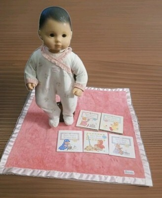 This American Girl doll lot includes a 2013 Bitty Baby doll with brown hair, a cozy blanket, and several books for your child to enjoy.