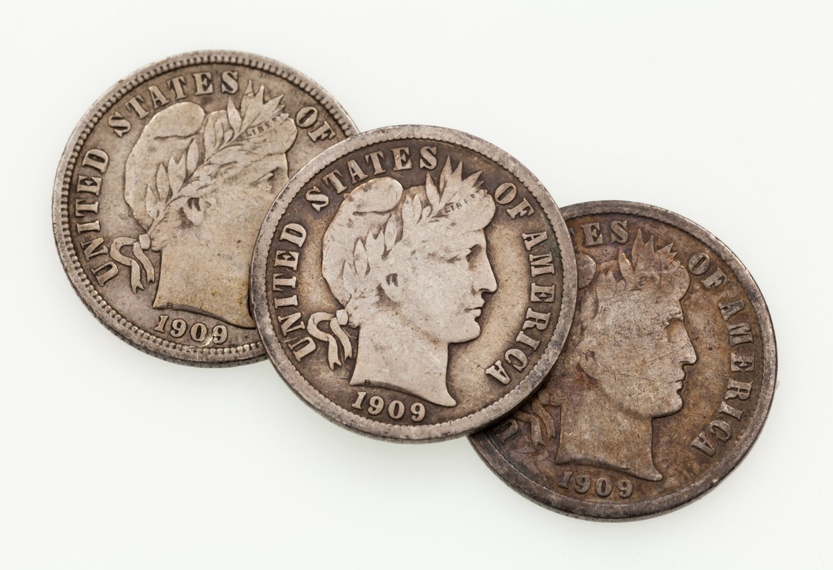 Lot of 3 1909 Barber Dimes (P + D + S) in Very Good VG to Very Fine VF Condition
