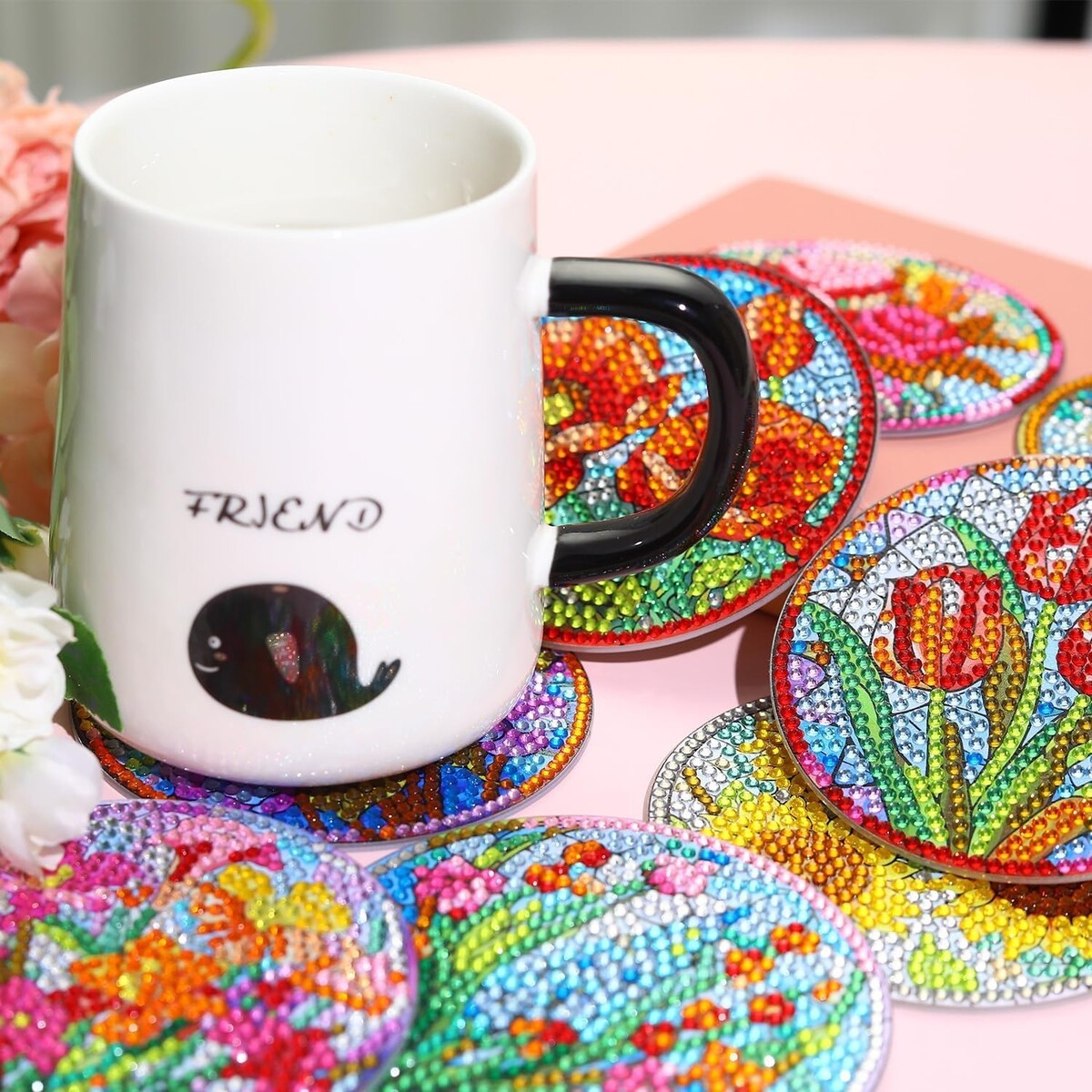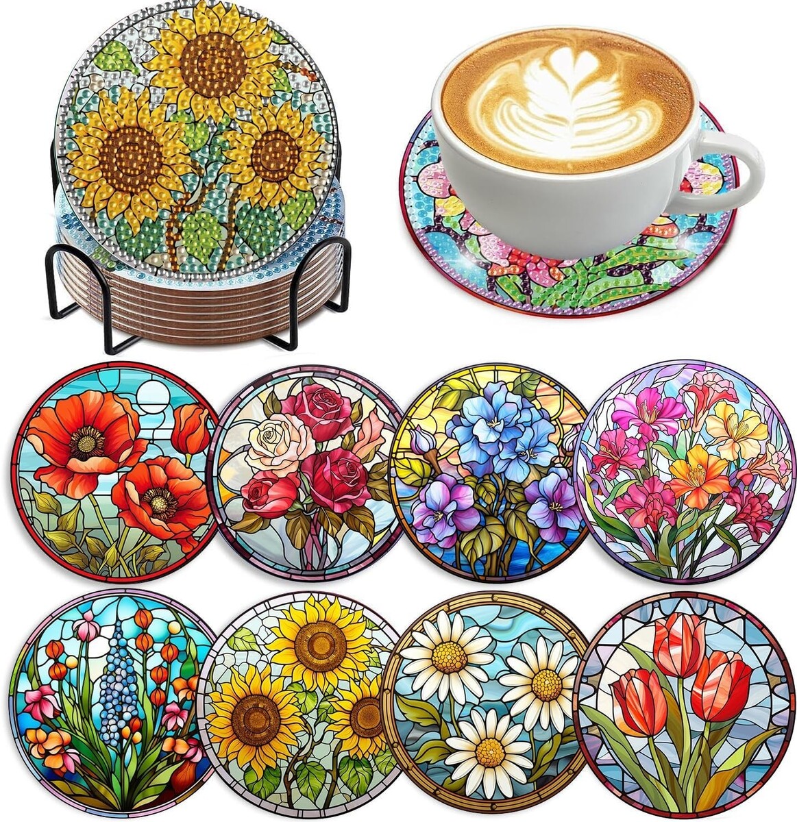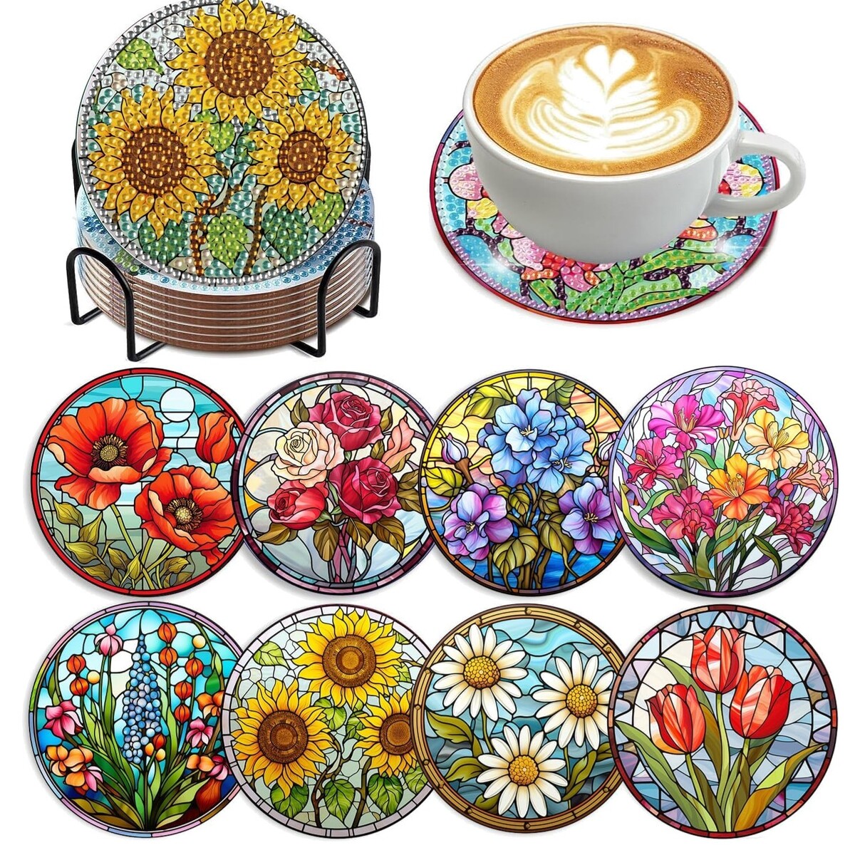 Elegant 8 PCS Floral Diamond Art Coasters Set - DIY Drink Coasters with Holder