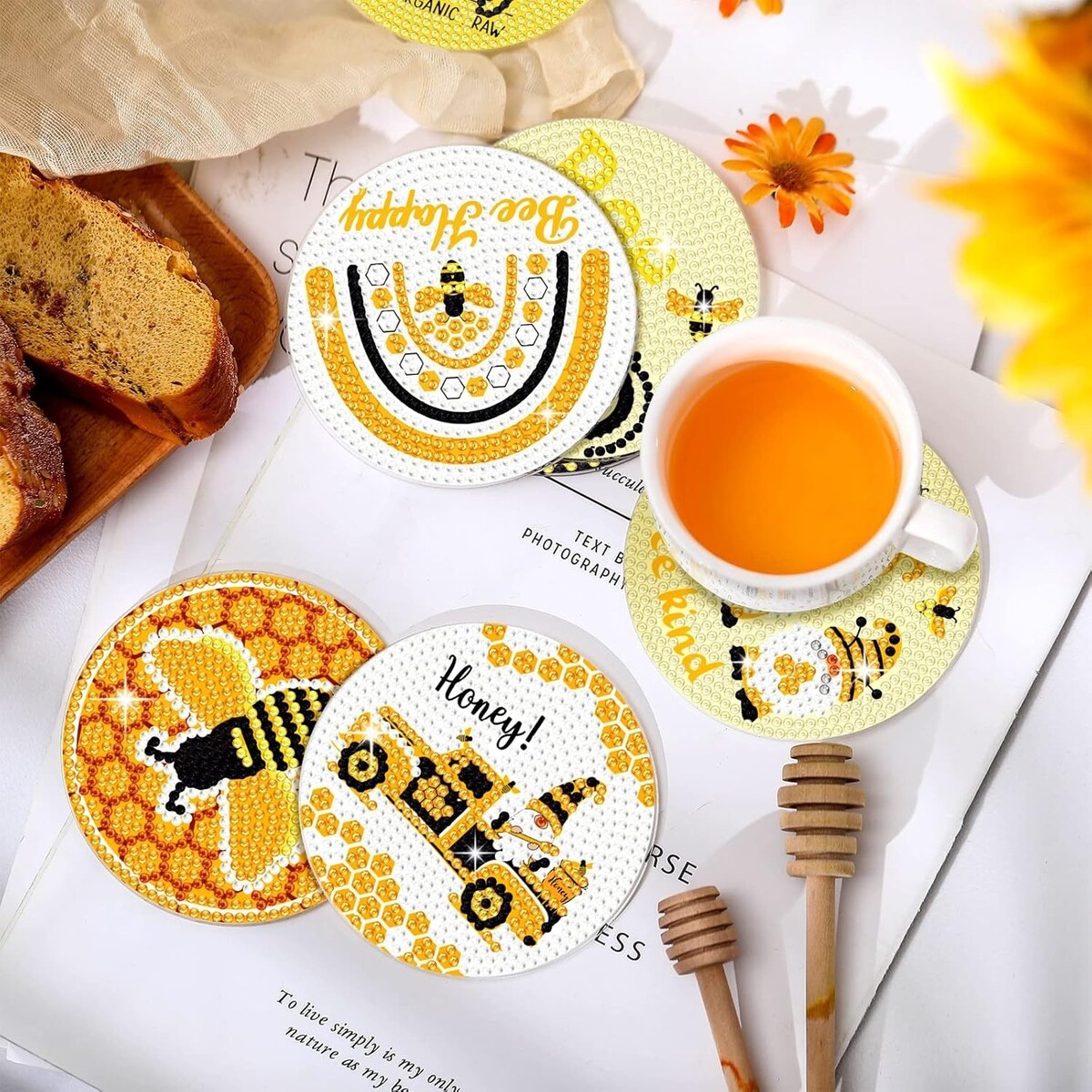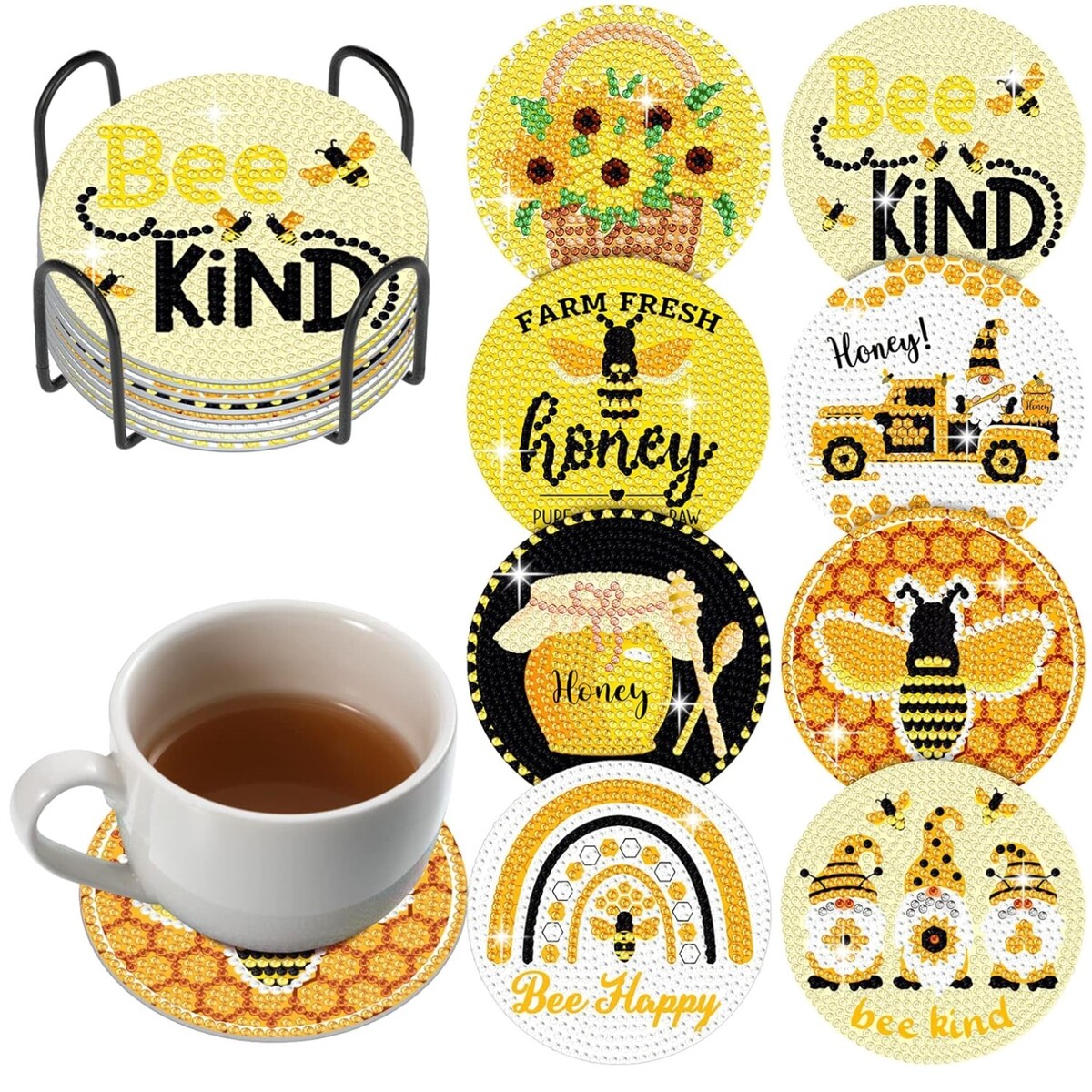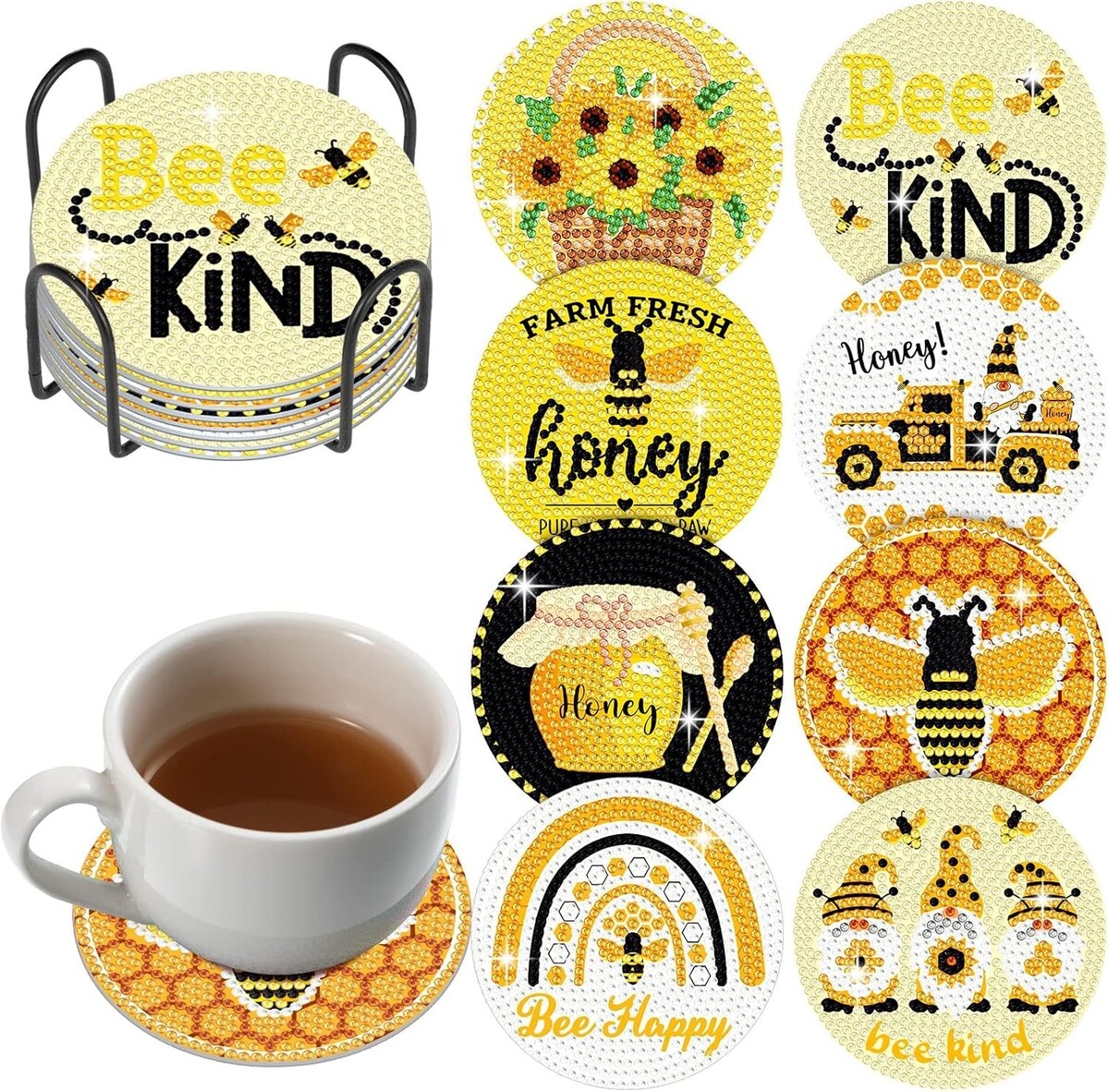 8 pieces of diamond art coasters featuring charming bee-themed designs.