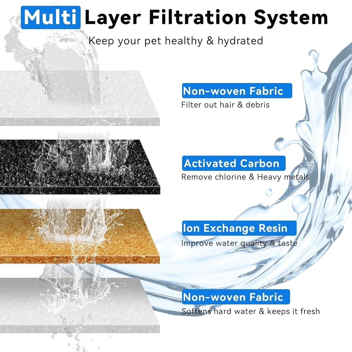 Triple Water Flow Modes: Choose from a faucet stream, dolphin spout waterfall, or gentle bubble mode to encourage your pet to drink more.