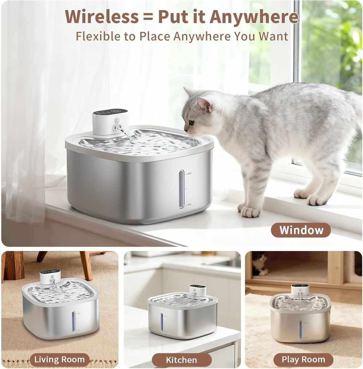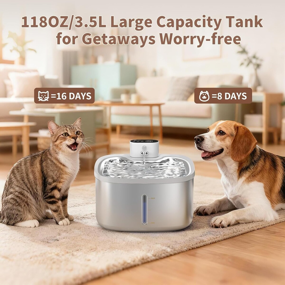 3.5L Capacity: This stainless steel cat water fountain offers a 118oz / 3.5L tank, providing enough fresh water for 10?15 days for an adult cat?perfect for busy professionals and multi-pet households.