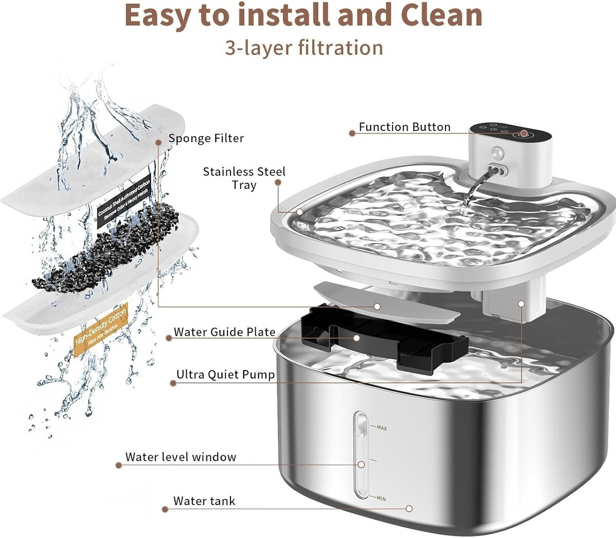 Upgraded Filtration System: Features a multi-layer activated carbon filter that effectively removes hair, dust, and fine particles, ensuring each gulp is fresh and clean?a boon for pet health.