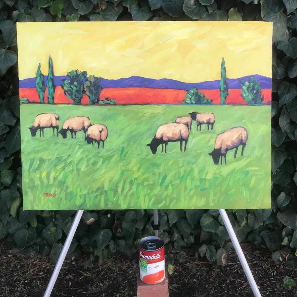 PATTY BAKER Original GRAZING SHEEP MODERN ABSTRACT LANDSCAPE Signed Oil & Canvas