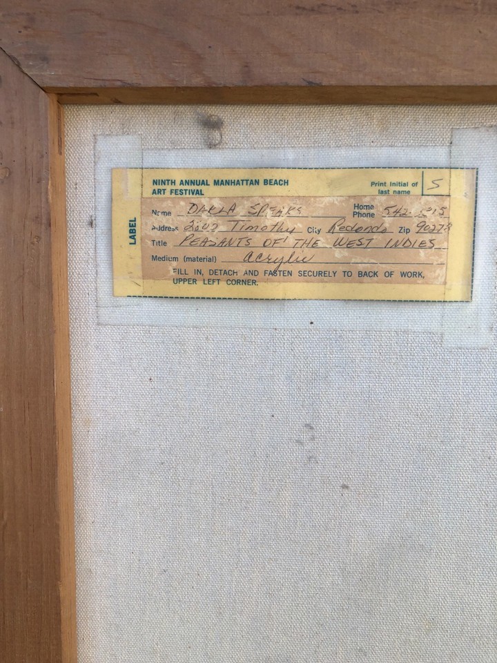 Darla Speaks was a modern artist and a painter active in the 1960s and 1970s in the Southern California area. Her most common media of choice was oil on canvas. She often chose West Indies, Polynesian and Pacific Islanders as subject matter, painting portraits and scenes of traditional island life. Her work was shown in multiple years at the Manhattan Beach Art Festival and at the Redondo Beach Art Festival in Southern California in the 1960s 1970s.