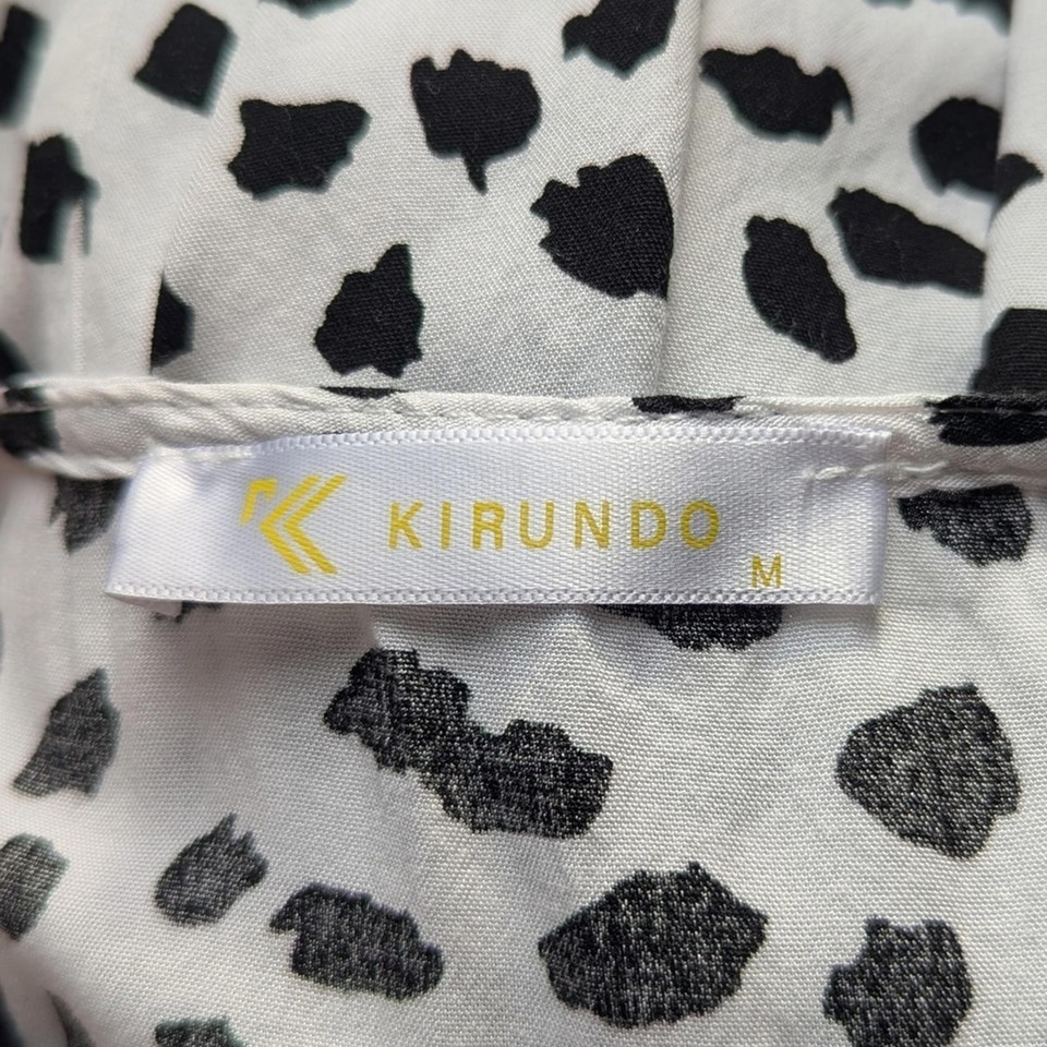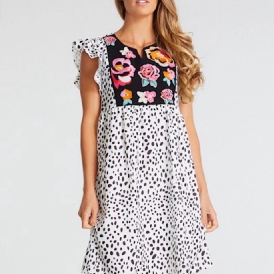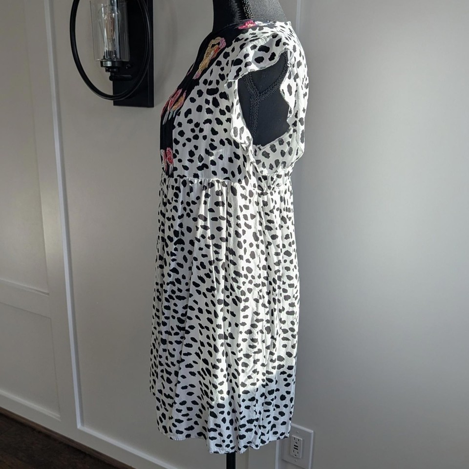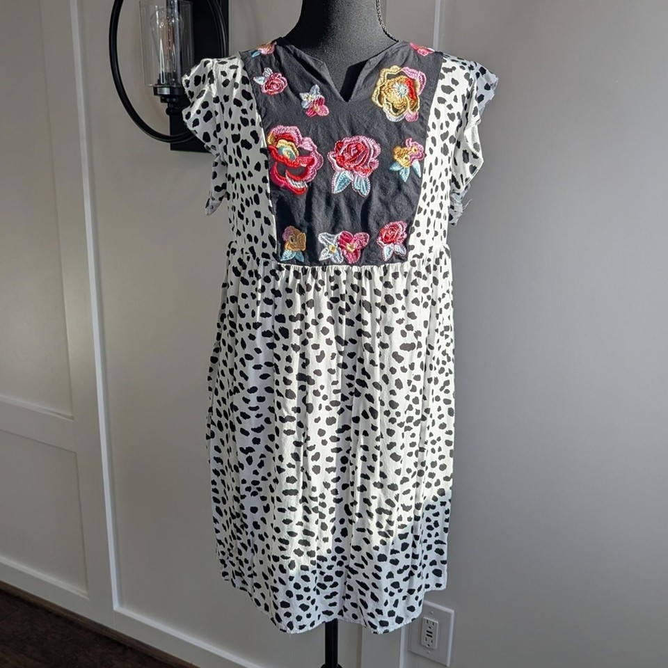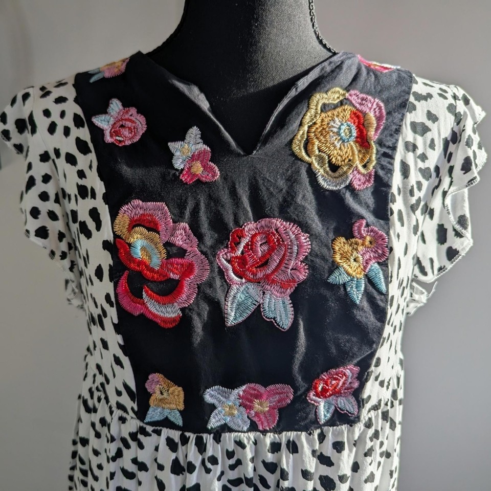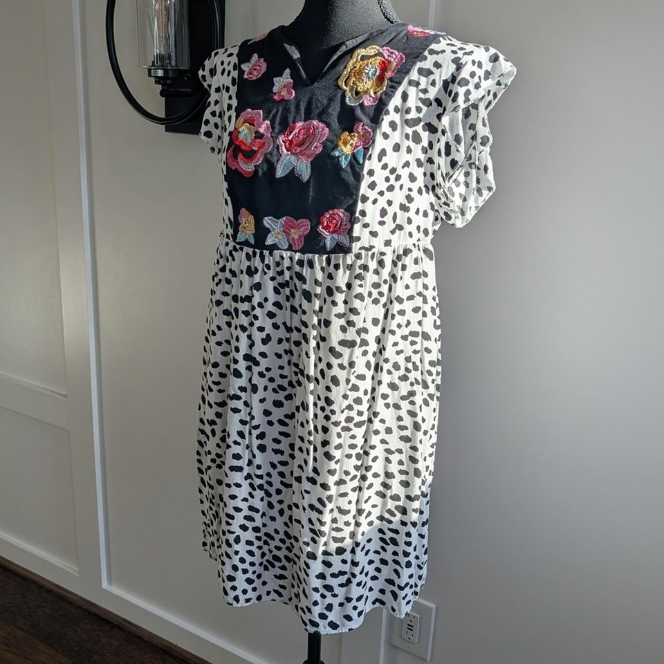 Kirundo women?s short dress featuring a black and white dalmatian-style print with colorful floral embroidery at the bodice. Designed with a relaxed, empire waist silhouette and lightweight woven fabric for an easy, comfortable fit. Finished with a split V-neckline and short flutter sleeves, making it ideal for casual wear, warm weather, or layering.