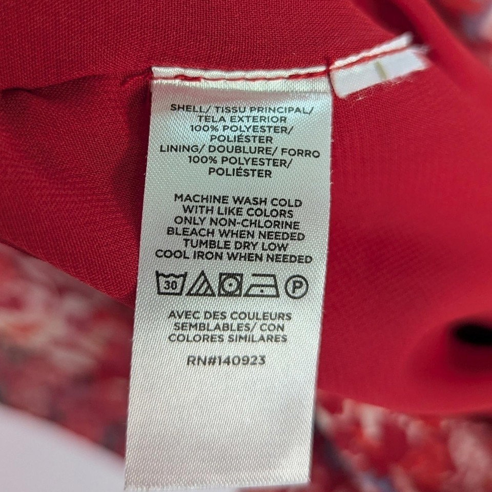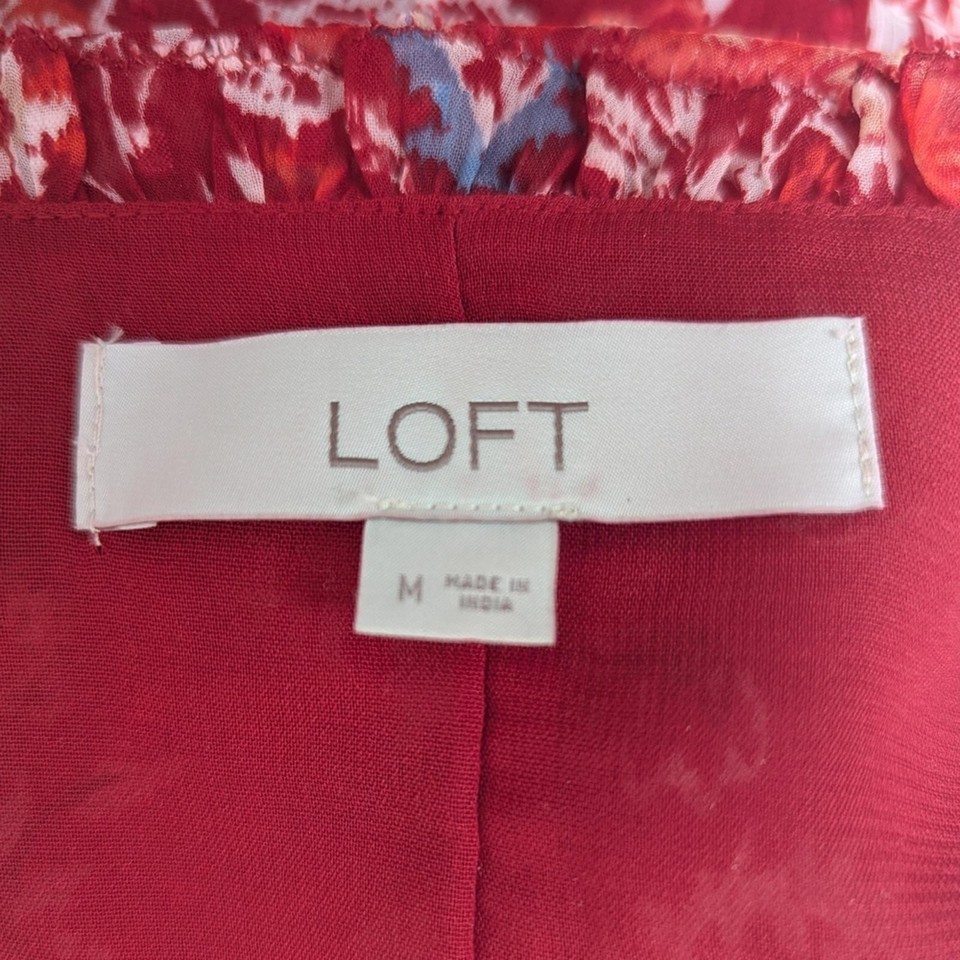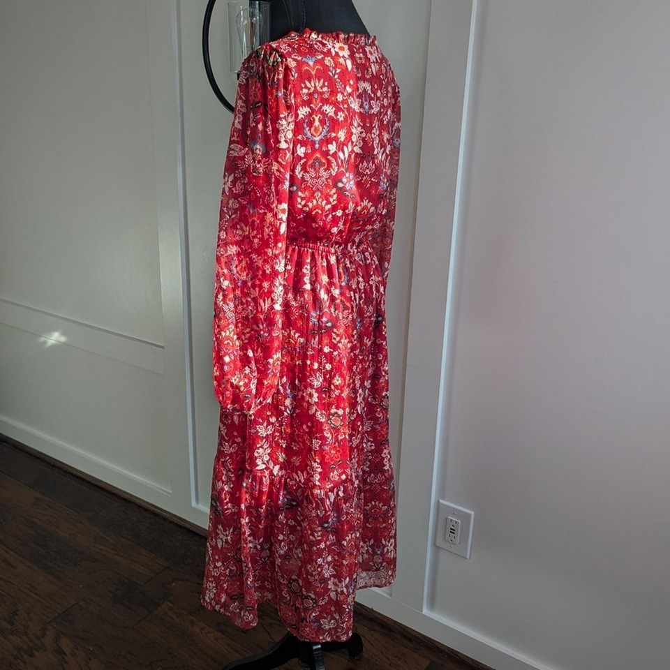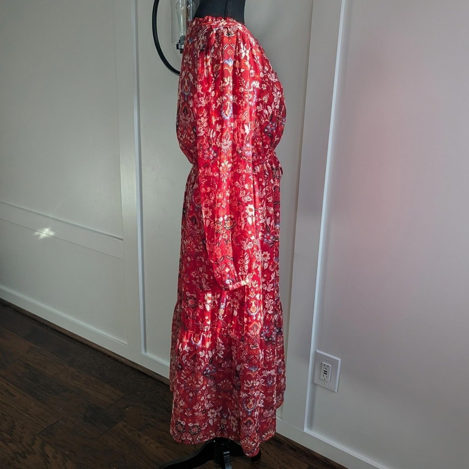 LOFT women?s red floral midi dress featuring a lightweight, flowy silhouette with a flattering elastic waist. Designed with a V-neckline, long sleeves with elastic cuffs, and a tiered skirt for added movement. Crafted from soft, breathable polyester and fully lined through the body for comfortable wear.