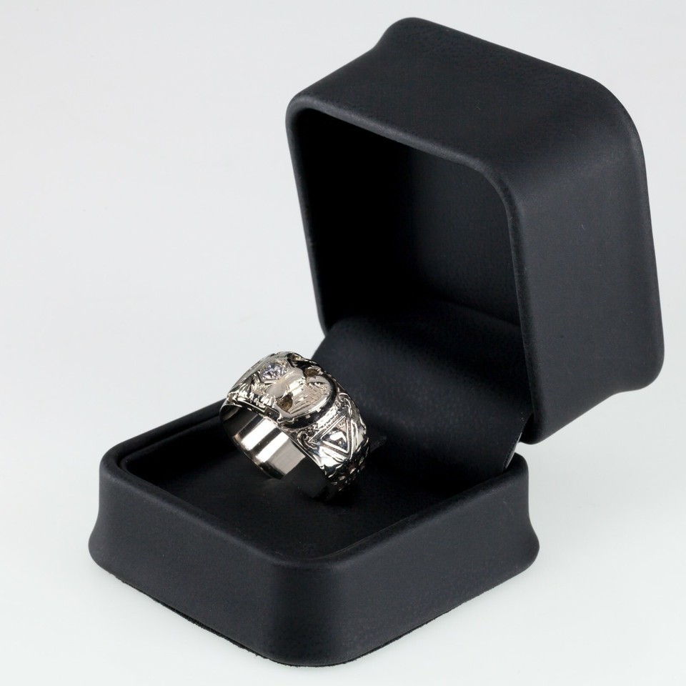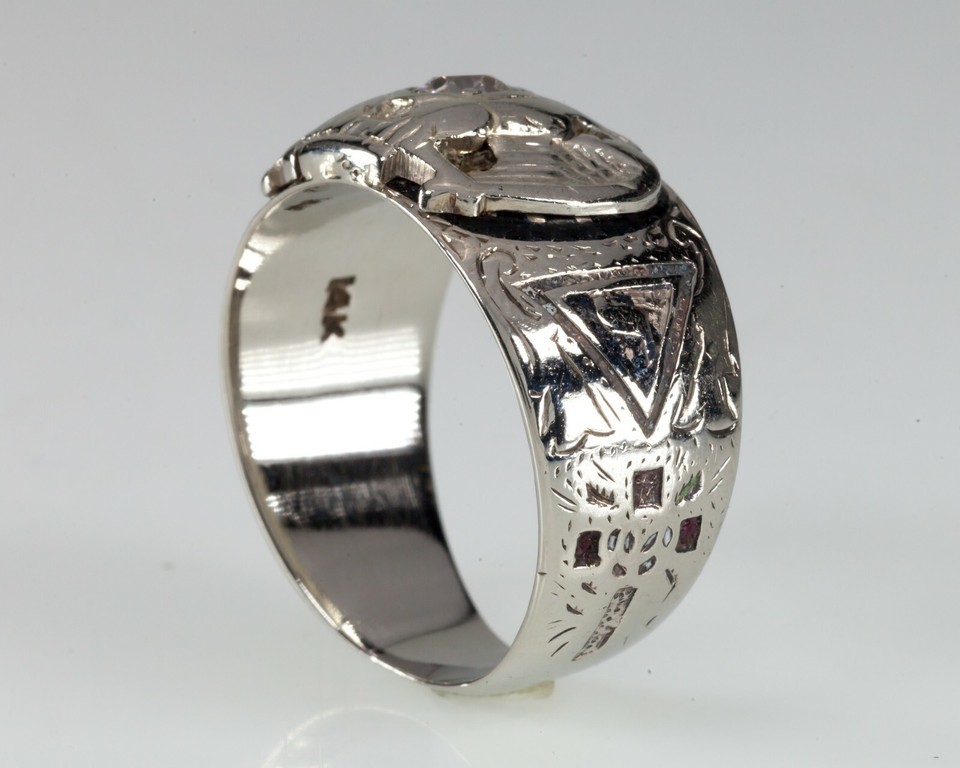 14k White Gold 32nd Degree Mason Eagle Diamond Ring with Enamel Size 11.5