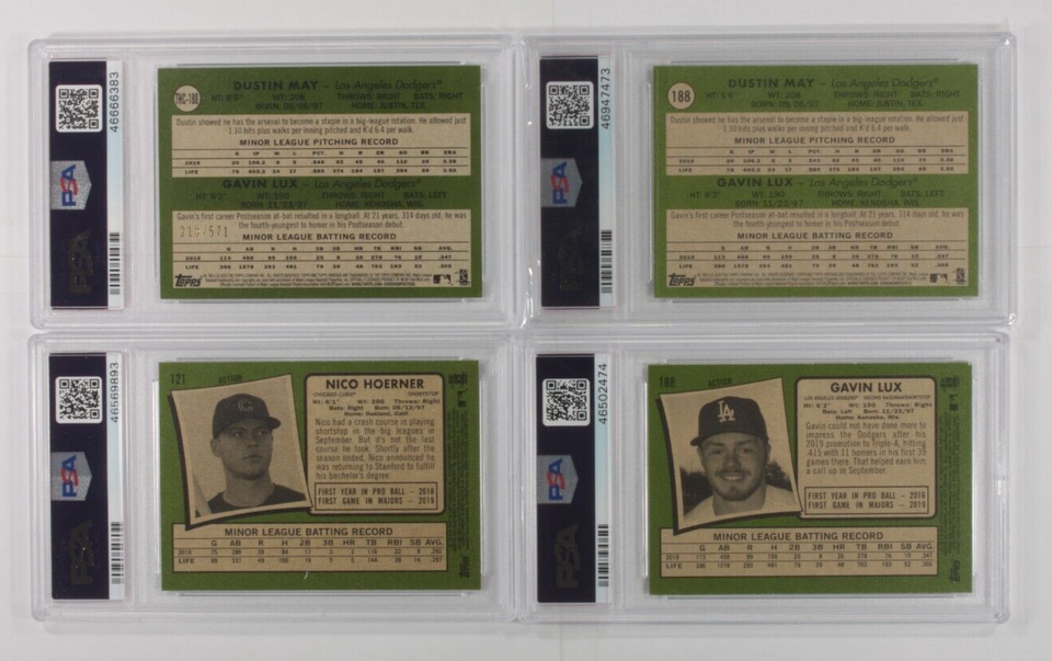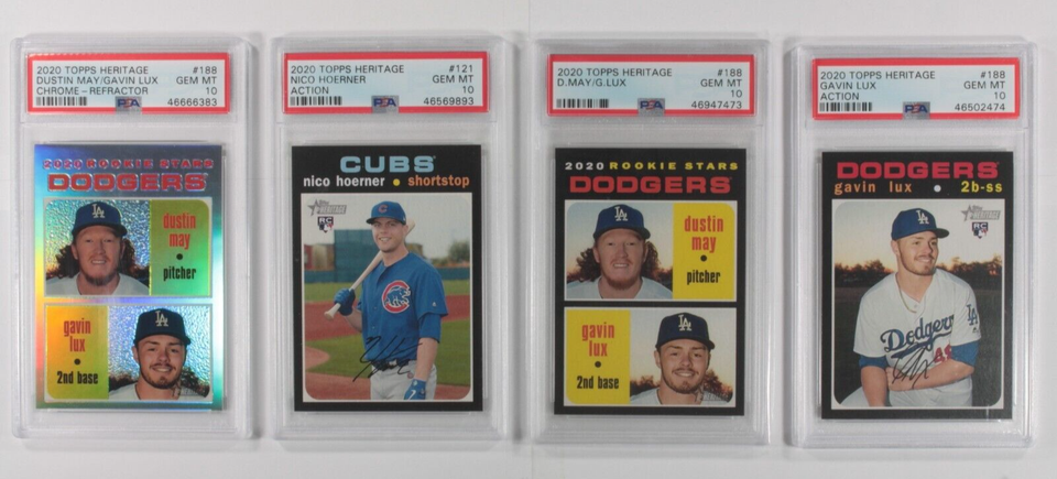 Lot 4 PSA 10 2020 Topps Heritage Nico Hoerner, Dustin May/Gavin Lux, gavin Lux